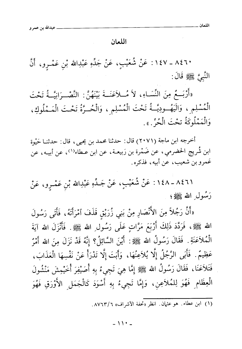 أَرْبَعٌ مِنَ النِّسَاءِ، لَا مُلَاعَنَةَ بَيْنَهُنَّ: النَّصْرَانِيَّةُ تَحْتَ الْمُسْلِمِ، وَالَيَهُودِيَّةُ تَحْتَ الْمُسْلِمِ، وَالْحُرَّةُ تَحْتَ الْمَمْلُوكِ، وَالْمَمْلُوكَةُ تحْتَ الْحُرِّ.