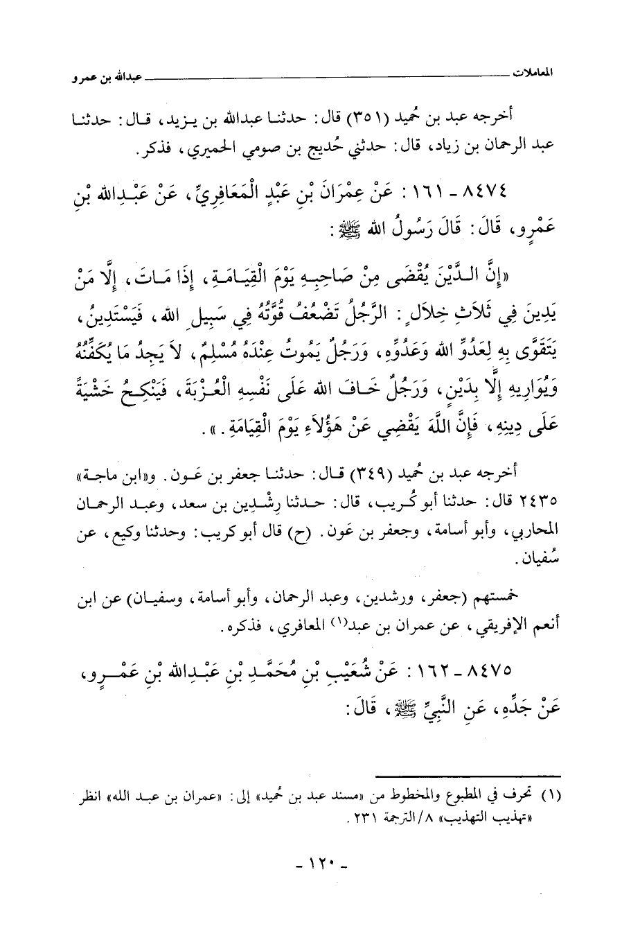 ٨٤٧٤ - عَنْ عِمْرَانَ بْنِ عَبْدٍ المَعَافِرِيِّ، عَنْ عَبْدِ اللهِ بْنِ عَمْرٍو، قَالَ: قَالَ رَسُولُ اللهِ صلى الله عليه وسلم:
