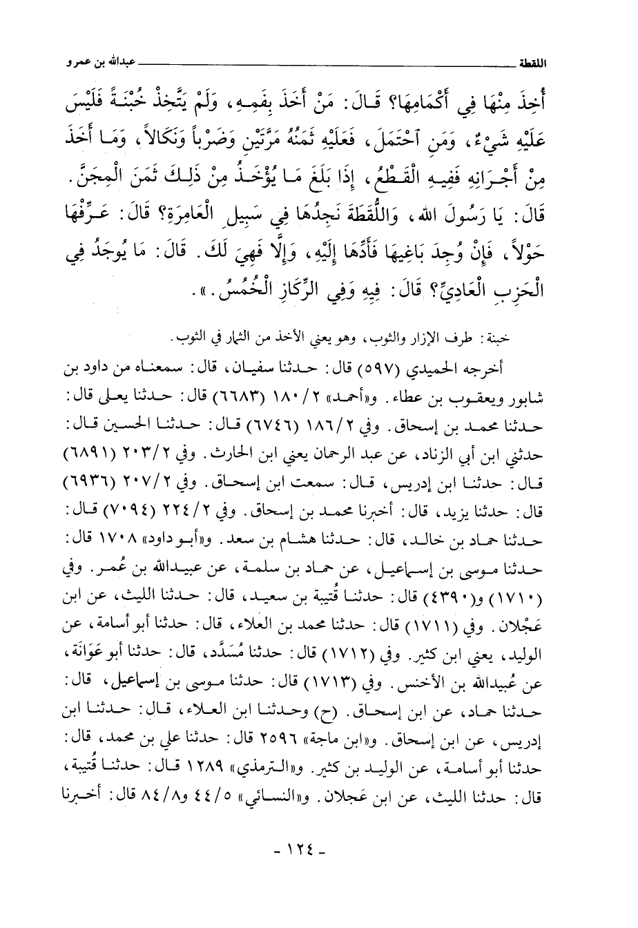 أُخِذَ مِنْهَا فِي أَكْمَامِهَا؟ قَالَ: مَنْ أَخَذَ بِفَمِهِ، وَلَمْ يَتَّخِذْ خُبْنَةً فَلَيْسَ عَلَيْهِ شَيْءٌ، وَمَنِ احْتَمَلَ، فَعَلَيْهِ ثَمَنُهُ مَرَّتَيْنِ، وَضَرْبًا وَنَكَالاً، وَمَا أَخَذَ مِنْ أَجْرَانِهِ فَفِيهِ الْقَطْعُ، إِذَا بَلَغَ مَا يُؤْخَذُ مِنْ ذَلِكَ ثَمَنَ الْمِجَنَّ. قَالَ: يَا رَسُولَ اللهِ، وَاللُّقَطَةُ نَجِدُهَا فِي سَبِيلِ الْعَامِرَةِ؟ قَالَ: عَرِّفْهَا حَوْلاً، فَإِنْ وُجِدَ بَاغِيهَا فَأَدِّهَا إِلَيْهِ، وَإِلَاّ فَهِيَ لَكَ. قَالَ: مَا يُوجَدُ فِي الْخَرِبِ الْعَادِيِّ؟ قَالَ: فِيهِ، وَفِي الرِّكَازِ الْخُمُسُ.
