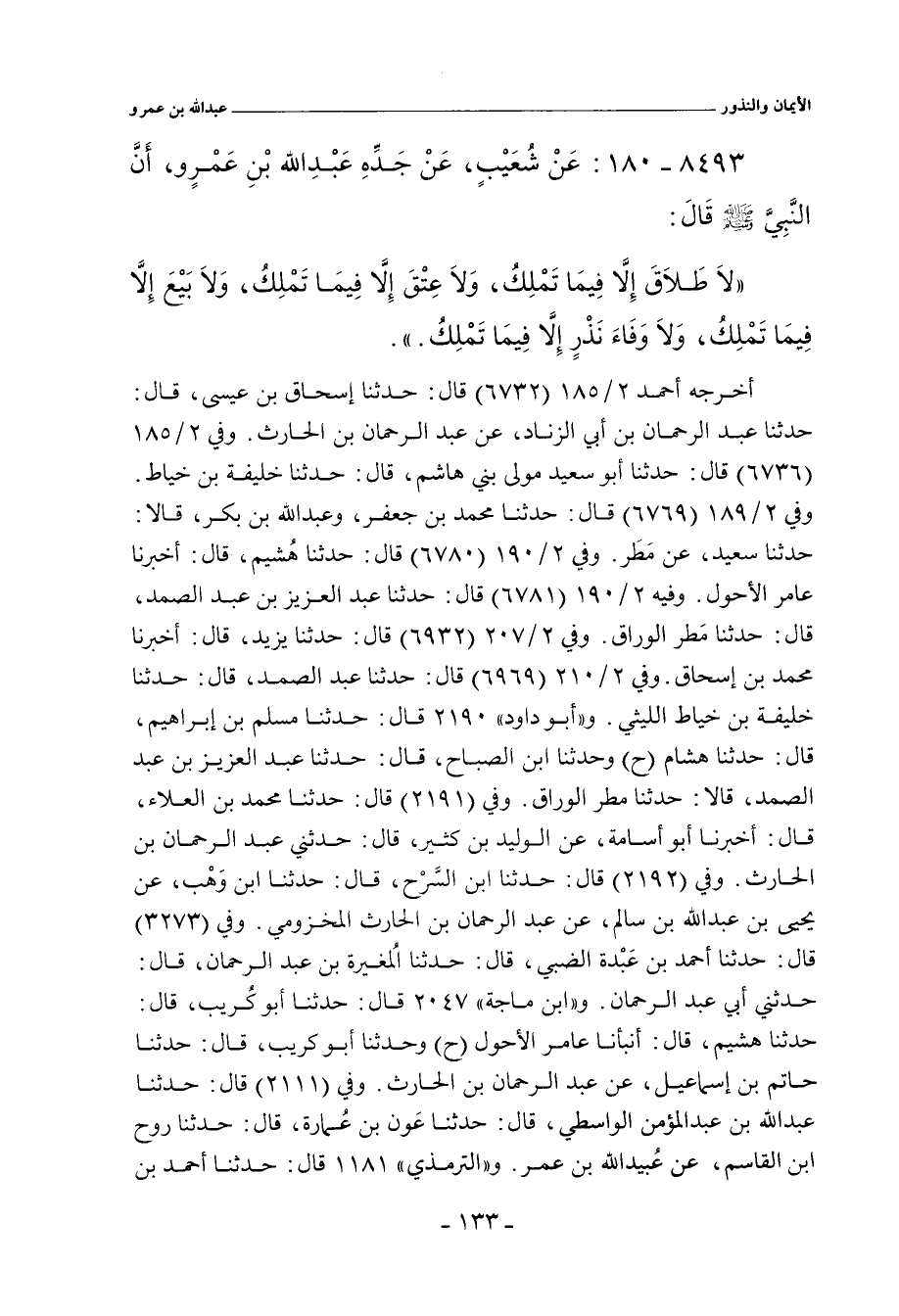 لَا طَلَاقَ إِلَاّ فِيمَا تَمْلِكُ، وَلَا عِتْقَ إِلَاّ فِيمَا تَمْلِكُ، وَلَا بَيْعَ إِلَاّ فِيمَا تَمْلِكُ، وَلَا وَفَاءَ نَذْرٍ إِلَاّ فِيمَا تَمْلِكُ.