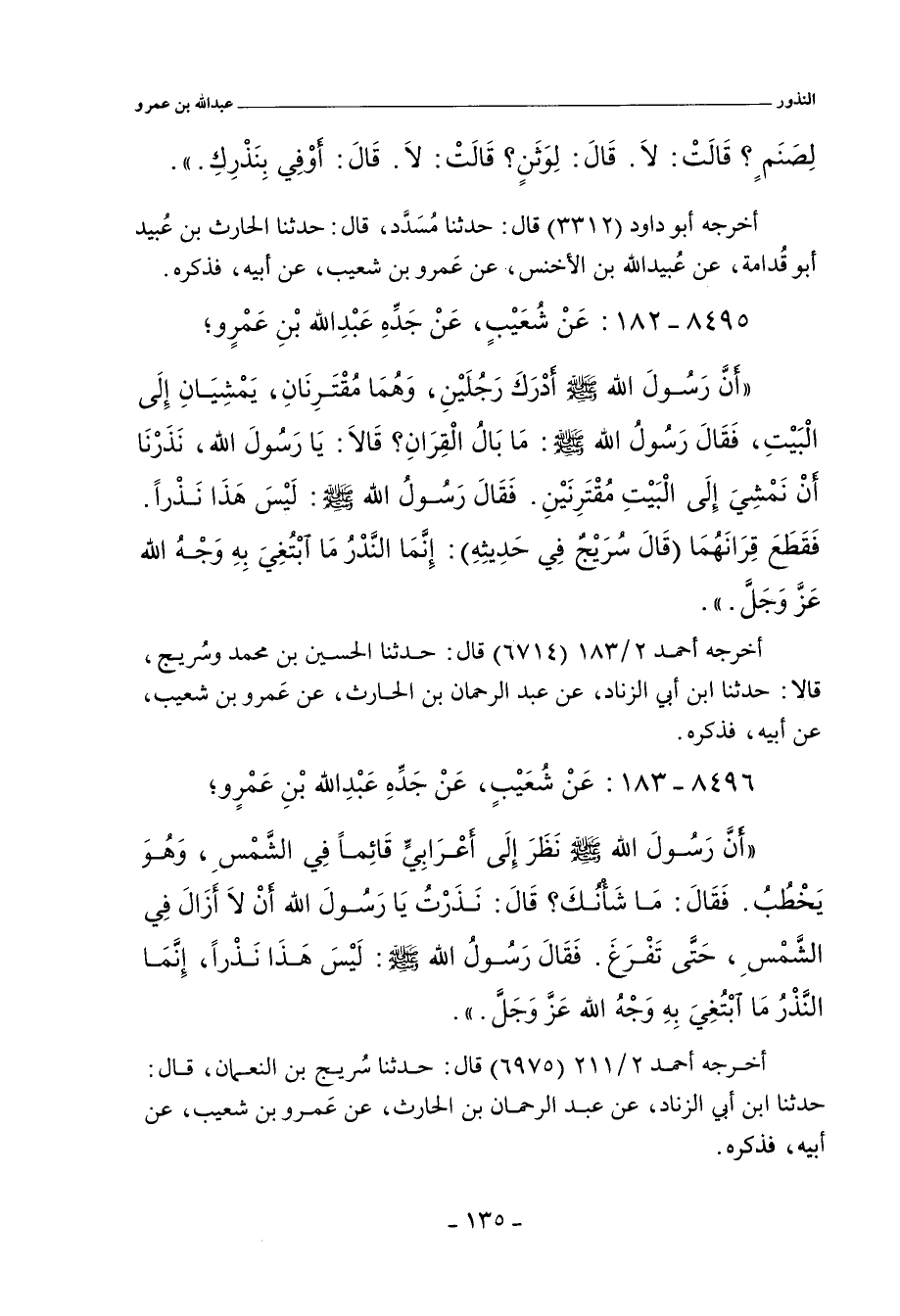 أَنَّ رَسُولَ اللهِ صلى الله عليه وسلم أَدْرَكَ رَجُلَيْنِ، وَهُمَا مُقْتَرِنَانِ، يَمْشِيَانِ إِلَى الْبَيْتِ، فَقَالَ رَسُولُ اللهِ صلى الله عليه وسلم: مَا بَالُ الْقِرَانِ؟ قَالَا: يَا رَسُولَ اللهِ، نَذَرْنَا أَنْ نَمْشِيَ إِلَى الْبَيْتِ مُقْتَرِنَيْنِ. فَقَالَ رَسُولُ اللهِ صلى الله عليه وسلم: لَيْسَ هَذَا نَذْرًا. فَقَطَعَ قِرَانَهُمَا (قَالَ سُرَيْجٌ فِي حَدِيثِهِ): إِنَّمَا النَّذْرُ مَا ابْتُغِيَ بِهِ وَجْهُ اللهِ، عَزَّ وَجَلَّ.