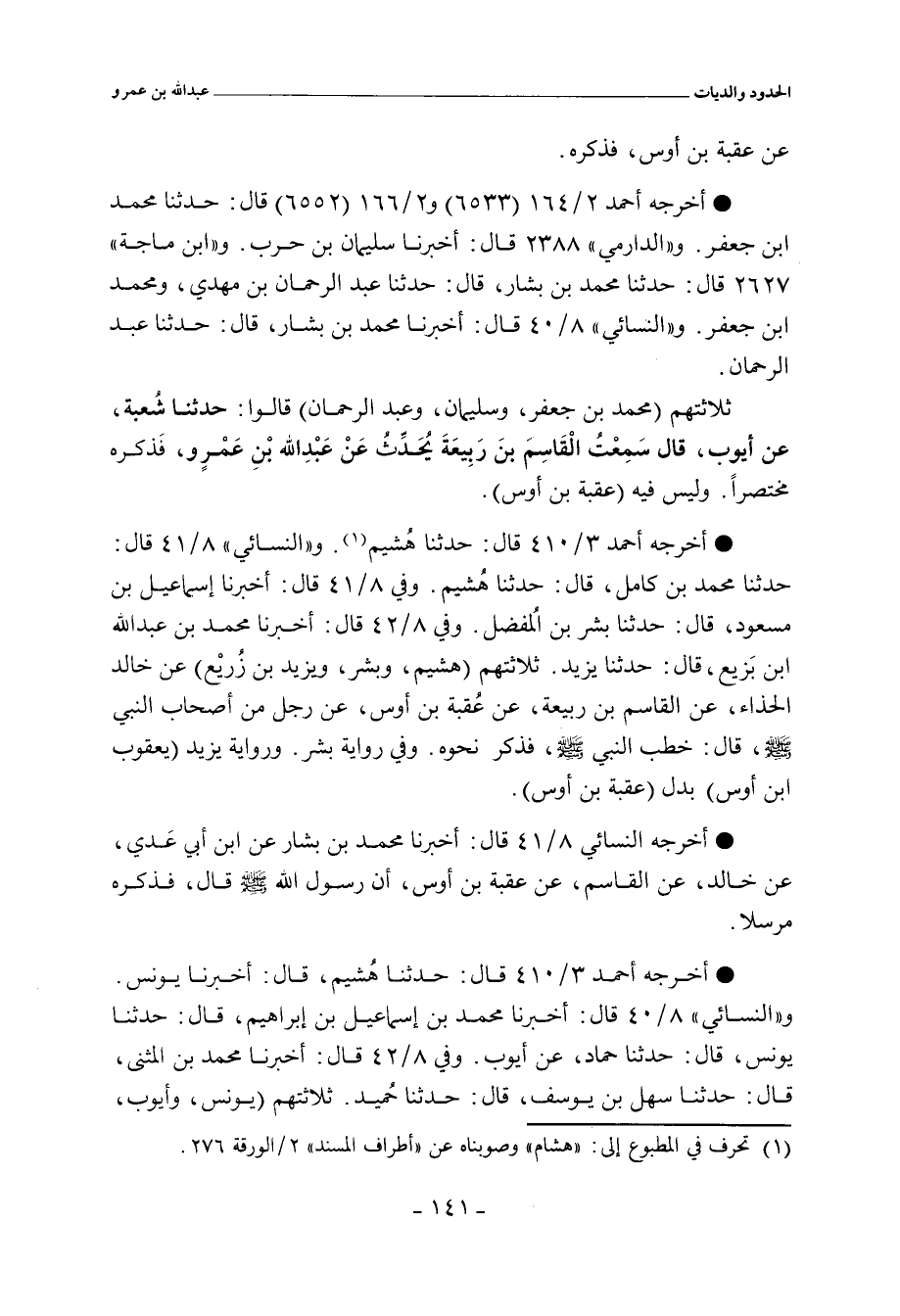 خمستهم (سفيان الثوري، وهشيم، وإسماعيل، وبشر، ويزيد بن زر يع) عن خالد الحذاء، عن القاسم بن ربيعة بن جوشن، عن عُقبة بن أوس، عن رجل من أصحاب النبي صلى الله عليه وسلم.