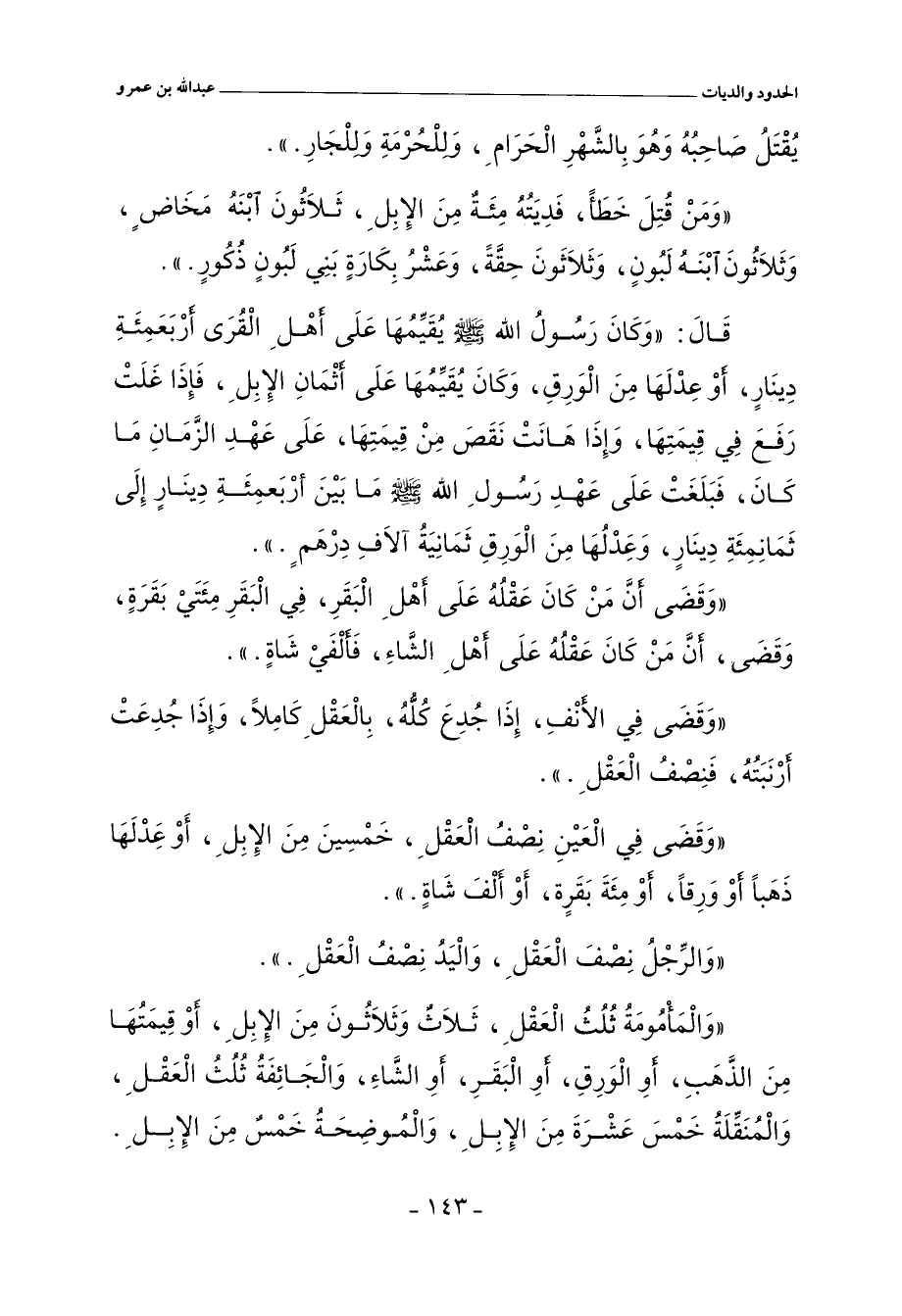 قَالَ: وَكَانَ رَسُولُ اللهِ (يُقَيِّمُهَا عَلَى أَهْلِ الْقُرَى، أَرْبَعَمِئةِ دِينَارٍ، أَوْ عِدْلَهَا مِنَ الْوَرِقِ، وَكَانَ يُقَيِّمُهَا عَلَى أَثْمَانِ الإِبِلِ، فَإِذَا غَلَتْ رَفَعَ فِي قِيمَتِهَا، وَإِذَا هَانَتْ نَقَصَ مِنْ قِيمَتِهَا، عَلَى عَهْدِ الزَّمَانِ مَا كَانَ، فَبَلَغَتْ عَلَى عَهْدِ رَسُولِ اللهِ (مَا بَيْنَ أَرْبَعمِئَةِ دِينَارٍ إِلَى ثَمَانِمِئَةِ دِينَارٍ، وَعَِدْلُهَا مِنَ الْوَرِقِ ثَمَانِيَةُ آلَافِ دِرْهَمٍ.