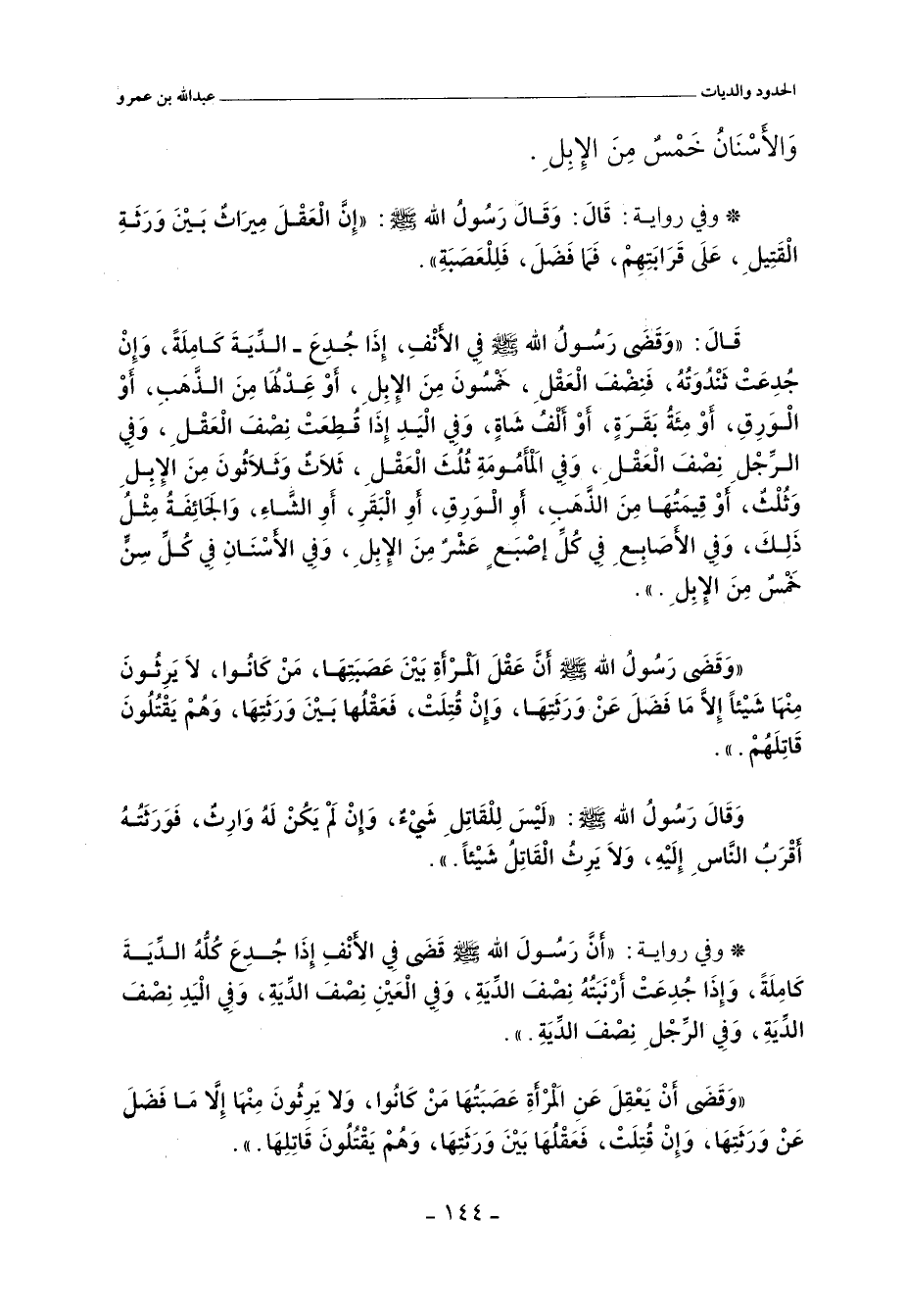 قَالَ: وَقَضَى رَسُولُ اللهِ (، فِي الأَنْفِ إِذَا جُدِعَ، الدِّيَةَ كَامِلَةً، وَإِنْ جُدِعَتْ ثَنْدُوَتُهُ، فَنِصْفَ الْعَقْلِ، خَمْسُونَ مِنَ الإِبِلِ، أَوْ عِدلُهَا مِنَ الذَّهَبِ، أَوْ الْوَرِقِ، أَوْ مِئَةُ بَقَرَةٍ , أَوْ أَلْفُ شَاةٍ، وَفِي الْيَدِ إِذَا قُطِعَتْ نِصْفَ الْعَقْلِ، وَفِي الرِّجْلِ نِصْفَ الْعَقْلِ، وَفِي الْمَأْمُومَةِ ثُلُثَ الْعَقْلِ، ثَلَاثٌوَثَلَاثُونَ مِنَ الإِبِلِ وَثُلْثٌ، أَوْ قِيمَتُهَا مِنَ الذَّهَبِ، أَوِ الْوَرِقِ، أَوِ الْبَقَرِ، أَوِ الشَّاءِ، وَالَجَائِفَةُ مِثْلُ ذَلِكَ، وَفِي الأَصَابِعِ فِي كُلِّ إِصْبَعٍ عَشْرٌ مِنَ الإِبِلِ، وَفِي الأَسْنَانِ فِي كُلِّ سِنٍّ خَمْسٌمِنَ الإِبِلِ.