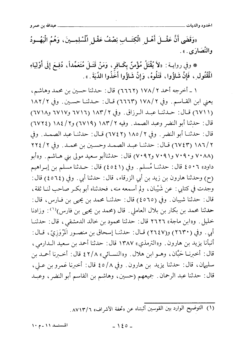 - وفي رواية: لَا يُقْتَلُ مُؤْمِنٌ بِكَافِرٍ، وَمَنْ قَتَلَ مُؤْمِنًا مُتَعَمِّدًا، دُفِعَ إِلَى أَوْلِيَاءِ الْمَقْتُولِ، فَإِنْ شَاؤُوا، قَتَلُوهُ، وَإِنْ شاؤُوا أَخَذُوا الدِّيَةَ.