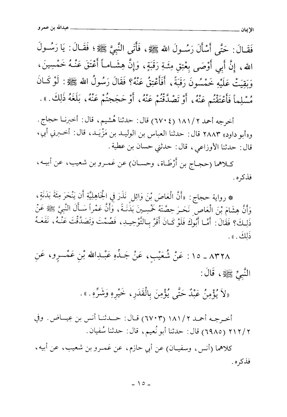 - وفي رواية: أَنَّ الْعَاصَ بْنَ وَائِلٍ نَذَرَ، فِي الْجَاهِلِيَّةِ، أَن يَنْحَرَ مِئَةَ بَدَنَةٍ، وَأَنَّ هِشَامَ بْنَ الْعَاصِ نَحَرَ حِصَّتَهُ خَمْسِينَ بَدَنَةً، وَأَنَّ عَمْرًا سَأَلَ النَّبِيَّ صلى الله عليه وسلم عَنْ ذَلِكَ؟ فَقَالَ: أَمَّا أَبُوكَ فَلَوْ كَانَ أَقَرَّ بِالتَّوْحِيدِ، فَصُمْتَ وَتَصدَّقْتَ عَنْهُ، نَفَعَهُ ذَلِكَ.