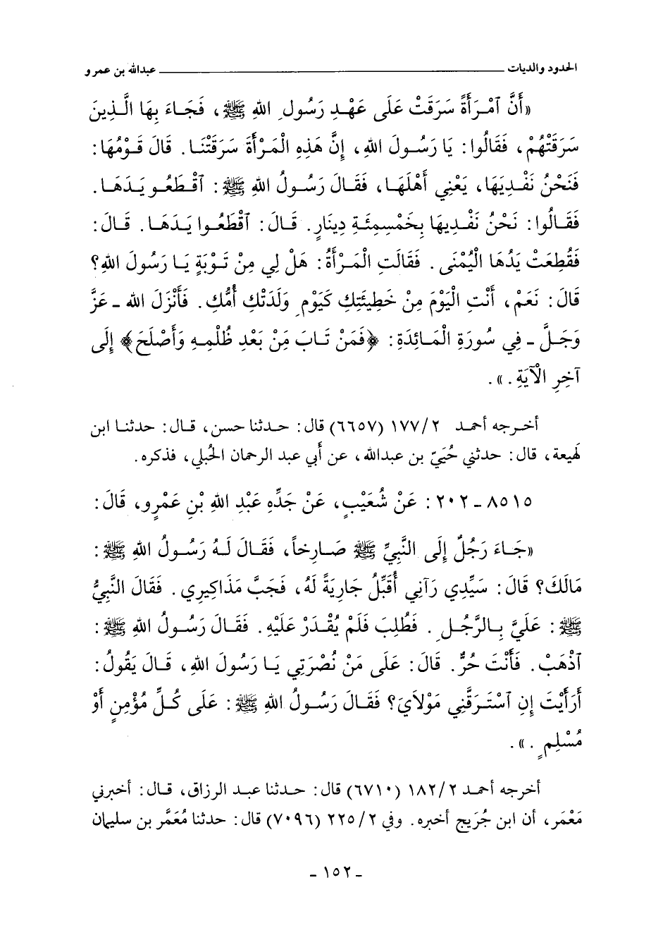 أَنَّ امْرَأَةً سَرَقَتْ، عَلَى عَهْدِ رَسولِ اللهِ صلى الله عليه وسلم، فَجَاءَ بِهَا الَّذِينَ سَرَقَتْهُمْ، فَقَالُوا: يَا رَسُولَ اللهِ، إِنَّ هَذِهِ الْمَرْأَةَ سَرَقَتْنَا. قَالَ قَوْمُهَا: فَنَحْنُ نَفْدِيَهَا، يَعْنِي أَهْلَهَا، فَقَالَ رَسُولُ اللهِ صلى الله عليه وسلم: اقْطَعُوا يَدَهَا. فَقَالُوا: نَحْنُ نَفْدِيَهَا بِخَمْسِمِئَةِ دِينَارٍ. قَالَ: اقْطَعُوا يَدَهَا. قَالَ: فَقُطِعَتْ يَدُهَا الْيُمْنَى. فَقَالَتِ الْمَرْأَةُ: هَلْ لِي مِنْ تَوْبَةٍ، يَا رَسُولَ اللهِ؟ قَالَ: نَعَمْ، أَنْتِ الْيَوْمَ مِنْ خَطِيئَتِكِ كَيَوْمِ وَلَدَتْكِ أُمُّكِ. فَأَنْزَلَ اللهُ، عَزَّ وَجَلَّ، فِي سُورَةِ الْمَائِدَةِ: " فََمَنْ تَابَ مِنْ بَعْدِ ظُلْمِهِ وَأَصْلَحَ)، إِلَى آخِرِ الآيَةِ.