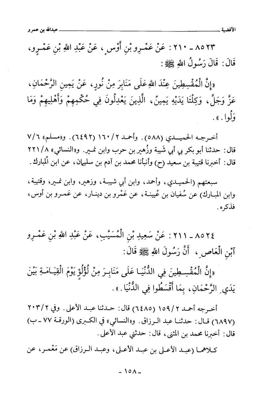 - وفي رواية: الْمُقْسِطُونَ يَوْمَ الْقِيَامَةِ، عَلَى مَنَابِرَ مِنْ نُورٍ، عَنْ يَمِينِ الرَّحْمَانِ، وَكِلْتَا يَدَيْهِ يَمِينٌ، الْمُقْسِطُونَ عَلَى أَهْلِيهِمْ، وَأَوْلَادِهِمْ، وَمَا وَلُوا.