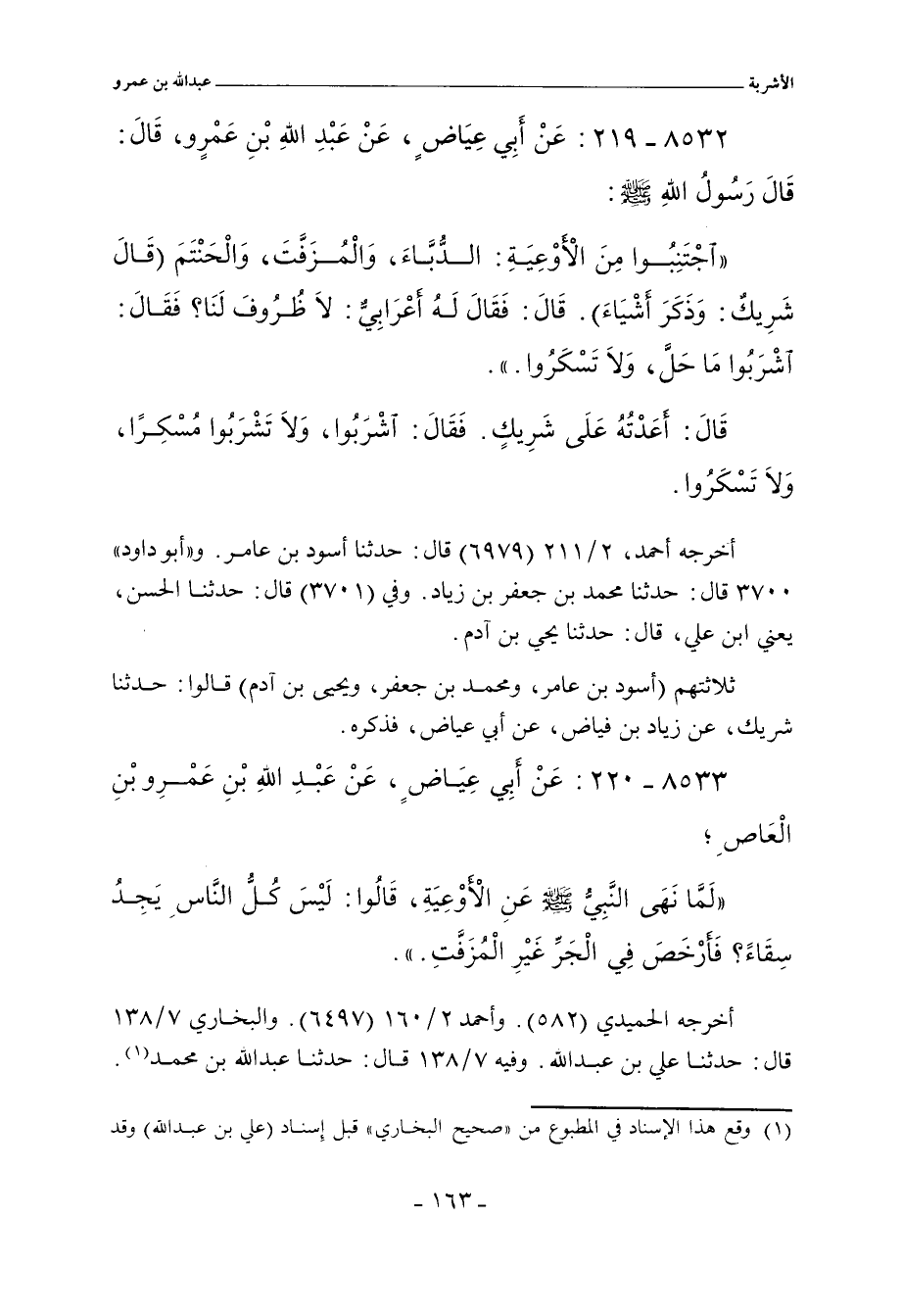 أَعَدْتُهُ (٣) عَلَى شَرِيكٍ. فَقَالَ: اشْرَبُوا، وَلَا تَشْرَبُوا مُسْكِرًا، وَلَا تَسْكَرُوا