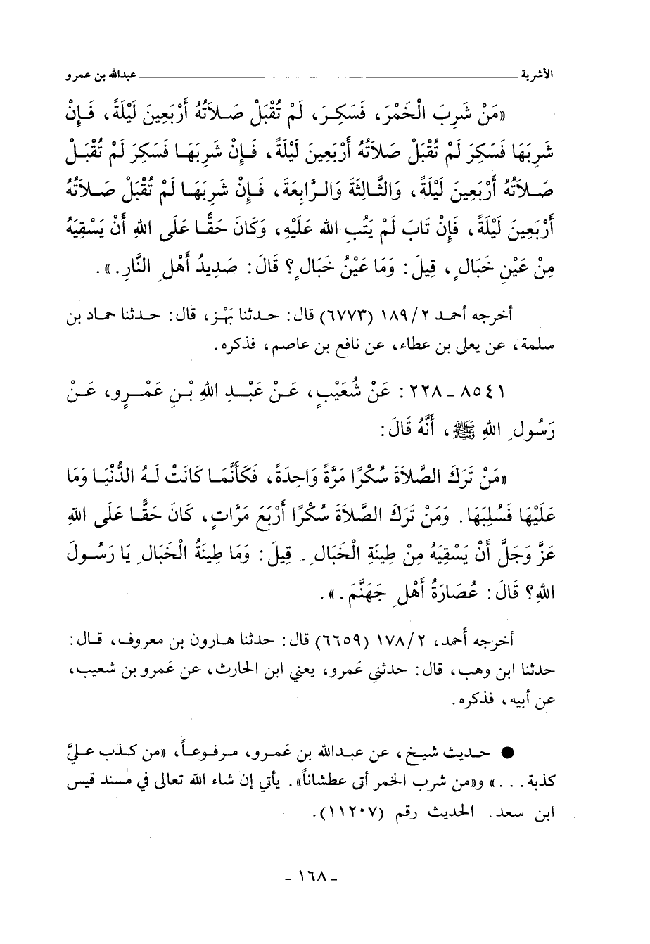 مَنْ شَرِبَ الْخَمْرَ، فَسَكِرَ، لَمْ تُقْبَلْ صَلَاتُهُ أَرْبَعِينَ لَيْلَةً، فَإِنْ شَرِبَهَا فَسَكِرَ، لَمْ تُقْبَلْ صَلَاتُهُ أَرْبَعِينَ لَيْلَةً، وَالثَّالِثَةَ وَالرَّابِعَةَ، فَإِنْ شَرِبَهَا لَمْ تُقْبَلْ لَهُ صَلَاةٌ أَرْبَعِينَ لَيْلَةً، فَإِنْ تَابَ لَمْ يَتُبِ اللهُ عَلَيْهِ، وَكَانَ حَقًّا عَلَى اللهِ أَنْ يَسْقِيَهُ مِنْ عَيْنِ خَبَالٍ، قِيلَ: وَمَا عَيْنُ خَبَالٍ؟ قَالَ: صَدِيدُ أَهْلِ النَّارِ.