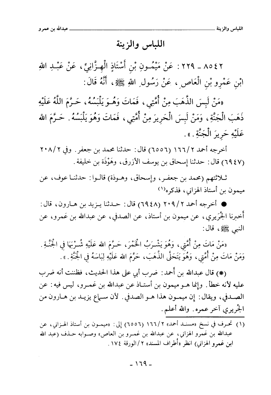 - قال عبد الله بن أحمد: ضرب أبي على هذا الحديث، فظننتُ أنه ضَرَبَ عليه لأنه خطأ، وإِنما هو ميمون بن أَستاذ , عن عبد الله بن عَمرو، ليس فيه: عن الصدفي)، ويقال: إن ميمون هذا هو الصدفِى، لأن سماع يزيد بن هارون من الجُريري في آخر عُمُره، والله أعلم.