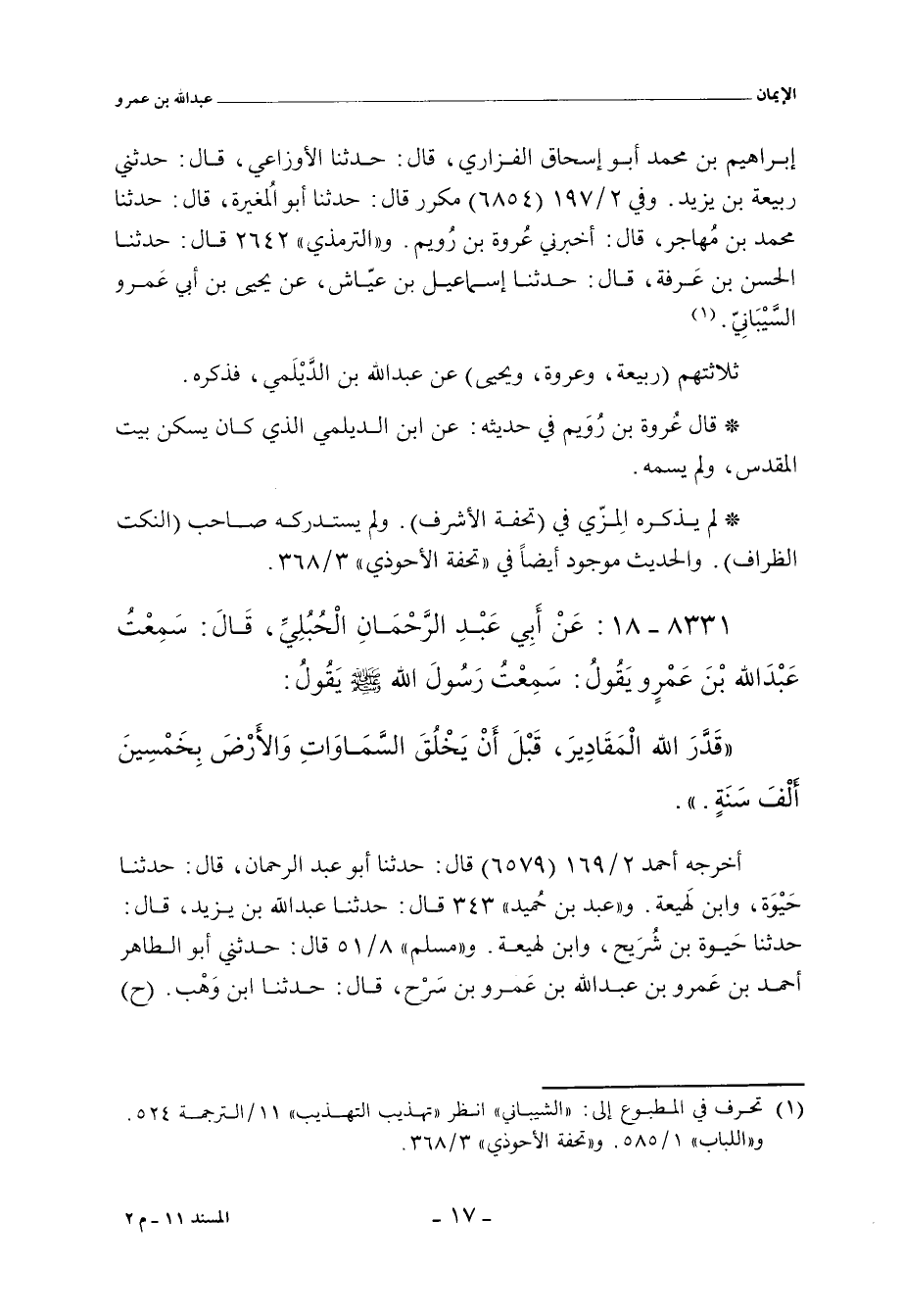 إبراهيم بن محمد أبو إسحاق الفزاري، حدَّثنا الأوزاعي، حدَّثني ربيعة بن يزيد. وفي ٢/ ١٩٧ (٦٨٥٤) قال: حدَّثنا أبو الُمغيرة، حدَّثنا محمد بن مُهاجر، أخبرني عُروة بن رُويم. و"التِّرمِذي" ٢٦٤٢ قال: حدَّثنا الحسن بن عَرفة، حدَّثنا إسماعيل بن عيّاش، عن يَحيى بن أبي عَمرو السيْبَانِيّ.