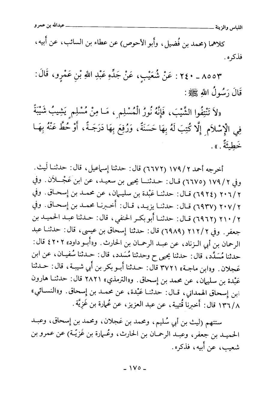 - وفي رواية: أَنَّ رَسُولَ اللهِ صلى الله عليه وسلم نَهَى عَنْ نَتْفِ الشَّيْبِ. وَقَالَ: إِنَّهُ نُورُ الإِسْلَامِ.