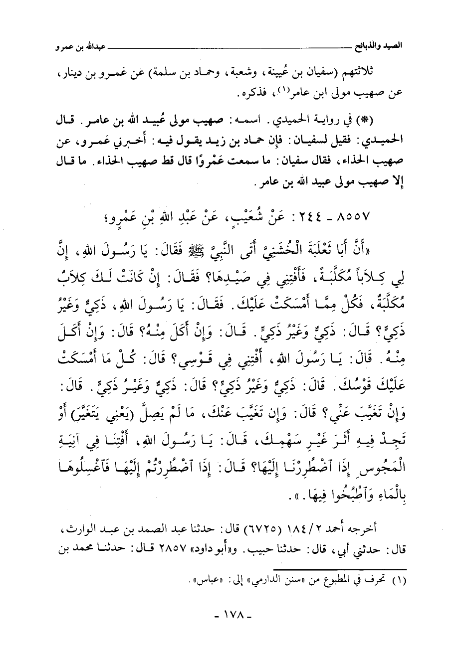 - في رواية الحميدي: صُهيب مولى عُبيد الله بن عامر) قال الحميدي: فقيل لسفيان: فإِن حماد بن زيد يقول فيه: أخبرني عَمرو، عن صُهيب الحذاء، فقال سفيان: ما سمعتُ عَمْرًا قال قط: صُهيب الحذاء، ما قال إِلا: صهيب، مولى عُبيد الله بن عامر.