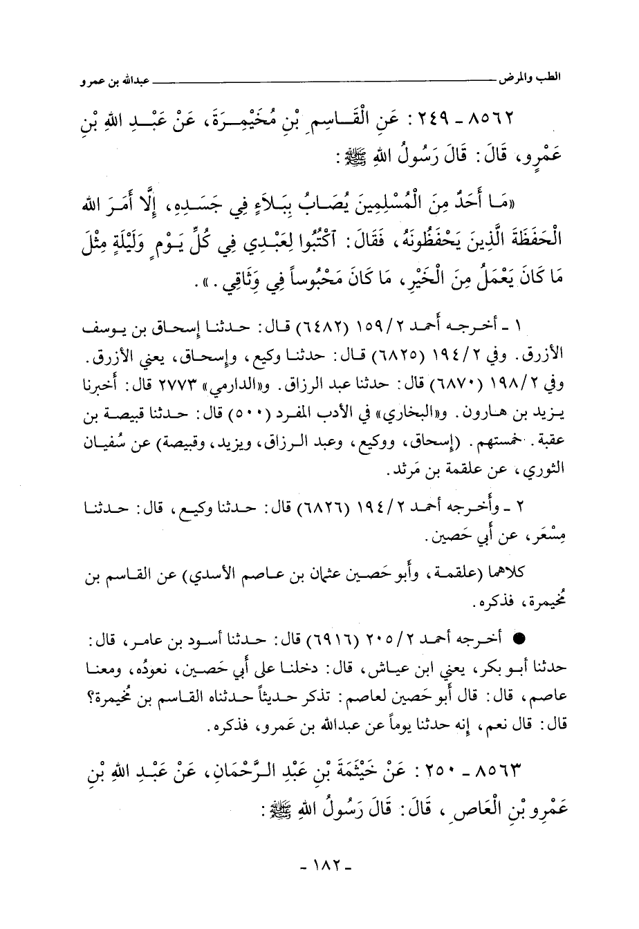 - وفي رواية: مَا أَحَدٌ مِنَ النَّاسِ، يُصَابُ بِبَلَاءٍ فِي جَسَدِهِ، إِلَاّ أَمَرَ اللَّهُ عَزَّ وَجَلَّ الْمَلَائِكَةَ، الَّذِينَ يَحْفَظُونَهُ، فَقَالَ: اكْتُبُوا لِعَبْدِي، كُلَّ يَوْمٍ وَلَيْلَةٍ، مَا كَانَ يَعْمَلُ مِنْ خَيْرٍ، مَا كَانَ فِي وِثَاقِي.