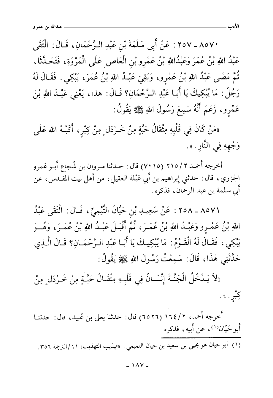 - لفظ يعلى: الْتَقَى عَبْدُ اللهِ بْنُ عَمْرٍو وَعَبْدُ اللهِ بْنُ عُمَرَ، ثُمَّ أَقْبَلَ عَبْدُ اللهِ بْنُ عُمَرَ، وَهُوَ يَبْكِي. فَقَالَ لَهُ الْقَوْمُ: مَا يُبْكِيكَ، يَا أَبَا عَبْدِ الرَّحْمَانِ؟ قَالَ: الَّذِي حَدَّثَنِي هَذَا. قَالَ: سَمِعْتُ رَسُولَ اللهِ صلى الله عليه وسلم يَقُولُ: لَا يَدْخُلُ الْجَنَّةَ إِنْسَانٌ، فِي قَلْبِهِ، مِثْقَالُ حَبَّةٍ مِنْ خَرْدَلٍ مِنْ كِبْرٍ.