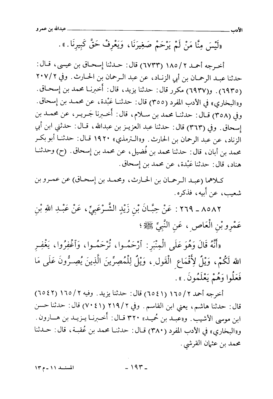 أخرجه أحمد ٢/ ١٨٥ (٦٧٣٣) قال: حدَّثنا إِسحاق بن عيسى، حدَّثنا عبد الرحمن بن أبي الزناد، عن عبد الرحمن بن الحارث. وفي ٢/ ٢٠٧ (٦٩٣٥ و ٦٩٣٧) قال: حدَّثنا يزيد، أَخْبَرنا محمد بن إِسحاق. و"البُخَارِي" في "الأدب المفرد" ٣٥٥ قال: حدَّثنا عَبْدة، عن محمد بن إِسحاق. وفي (٣٥٨) قال: حدَّثنا محمد بن سلام. قال: أَخْبَرنا جَرير، عن محمد بن إسحاق. وفي (٣٦٣) قال: حدَّثنا عبد العزيز بن عبد الله، حدَّثني ابن أبي الزناد، عن عبد الرحمن بن الحارث. و"التِّرمِذي" ١٩٢٠ قال: حدَّثنا أبو بكر محمد بن أبان، حدَّثنا محمد بن فُضيل، عن محمد بن إسحاق (ح) وحدَّثنا هناد، حدَّثنا عَبْدة، عن محمد بن إِسحاق.