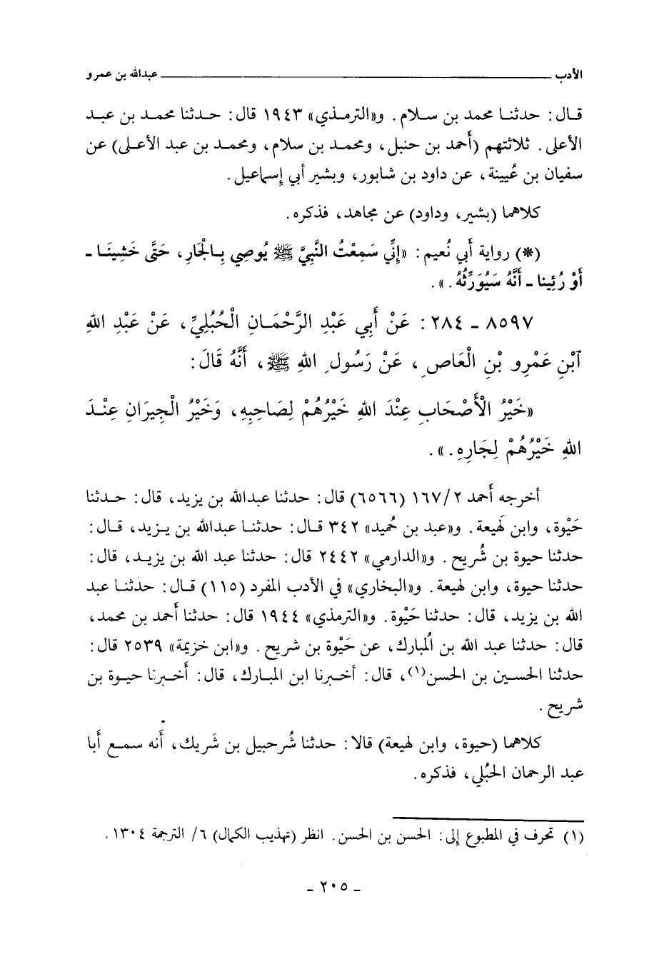 أخرجه أحمد ٢/ ١٦٧ (٦٥٦٦) قال: حدَّثنا عبد الله بن يزيد، حدَّثنا حَيْوة، وابن لَهِيعة. و"عَبد بن حُميد" ٣٤٢ قال: حدَّثنا عبد الله بن يزيد، حدَّثنا حيوة بن شُريح. و"الدارِمِي" ٢٤٣٧ قال: حدَّثنا عبد الله بن يزيد، حدَّثنا حيوة، وابن لَهِيعة. و"البُخَارِي" في "الأدب المفرد" ١١٥ قال: حدَّثنا عبد الله بن يزيد. قال: حدَّثنا حَيْوة. و"التِّرمِذي" ١٩٤٤ قال: حدَّثنا أحمد بن محمد، حدَّثنا عبد الله بن الُمبارك، عن حَيْوة بن شريح. و"ابن خزيمة" ٢٥٣٩ قال: حدَّثنا الحسين بن الحسن , أَخْبَرنا ابن المبارك، أَخْبَرنا حيوة بن شريح