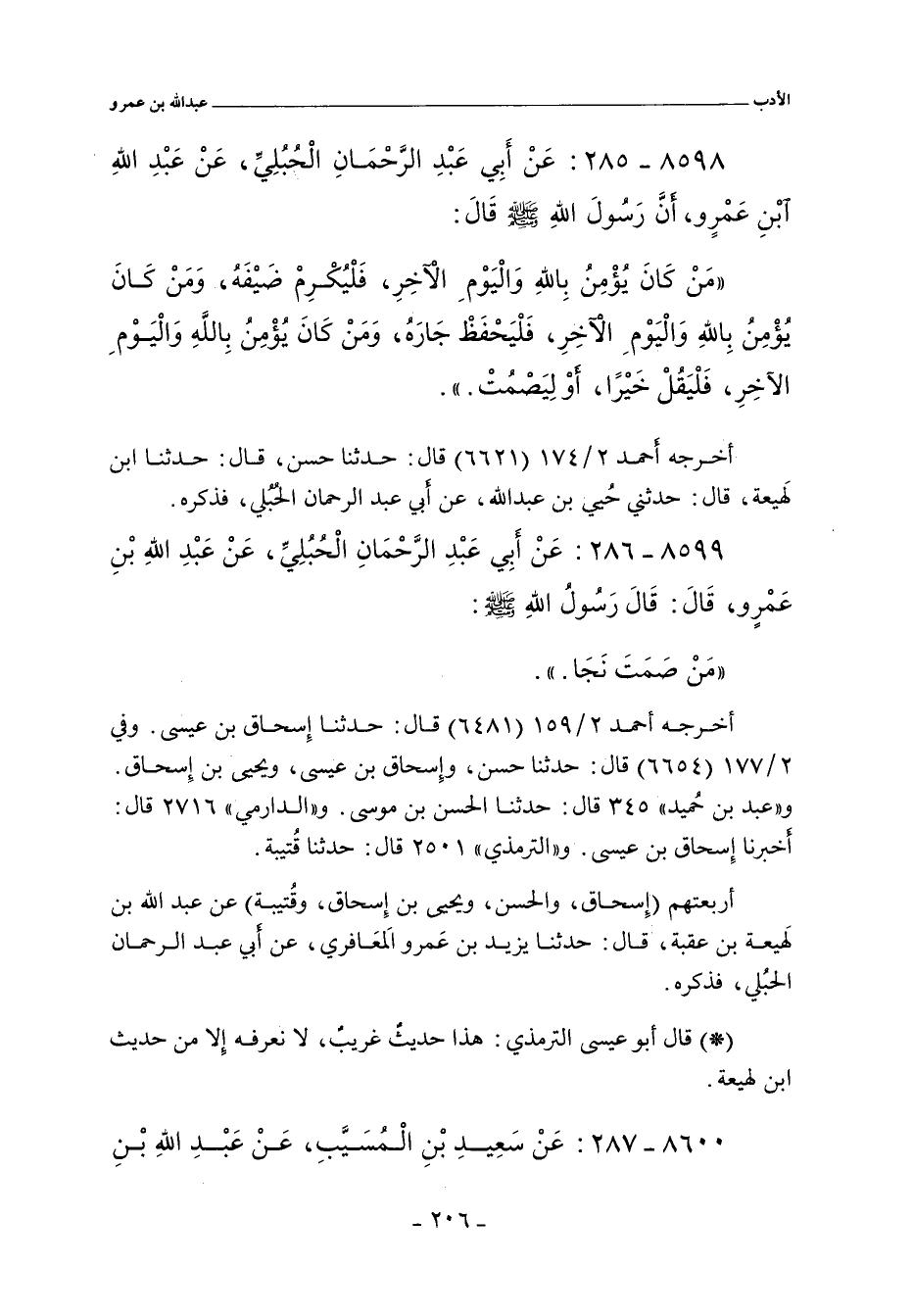 ٨٥٩٩ - عَنْ أَبِي عَبْدِ الرَّحْمَانِ الْحُبُلِيِّ، عَنْ عَبْدِ اللهِ بْنِ عَمْرٍو. قال: قَالَ رَسُولُ اللهِ صلى الله عليه وسلم: