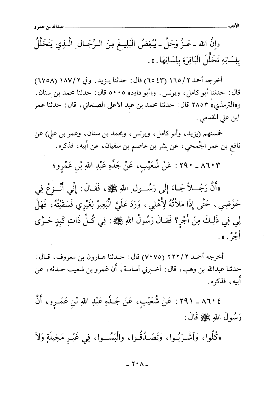 أخرجه أحمد ٢/ ١٦٥ (٦٥٤٣) قال: حدَّثنا يزيد. وفي ٢/ ١٨٧ (٦٧٥٨) قال: حدَّثنا أبو كامل، ويونس. و"أبو داود" ٥٠٠٥ قال: حدَّثنا محمد بن سنان الباهلي، وكان ينزل العوقة. و"التِّرمِذي" ٢٨٥٣ قال: حدَّثنا محمد بن عبد الأعلى الصنعاني، حدَّثنا عمر بن علي المقدمي.