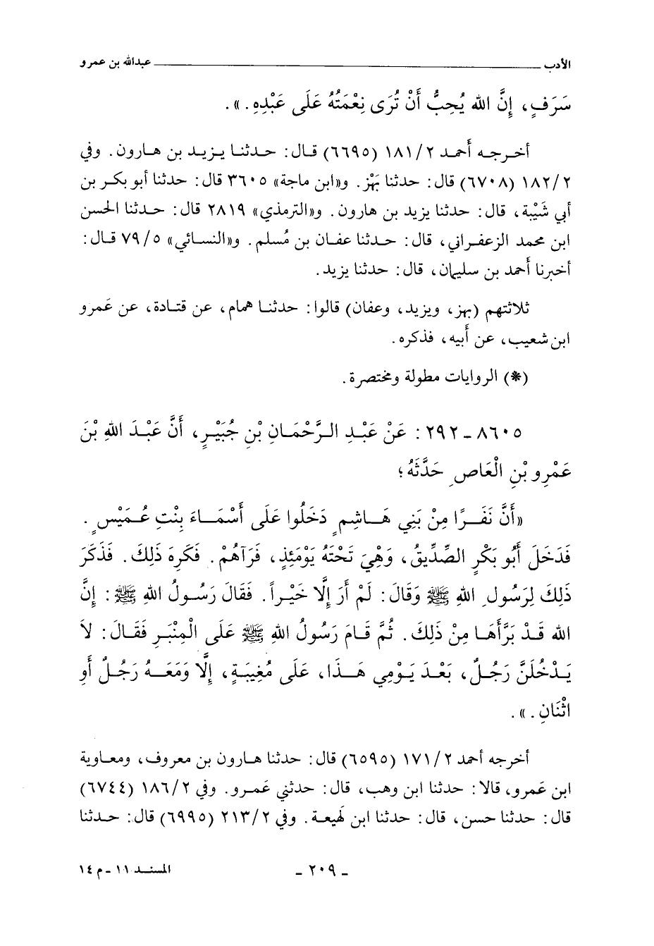 - وفي رواية: أَنَّ أَبَا بَكْرٍ الصِّدِّيقَ، رَضِيَ اللهُ عَنْهُ، تَزَوَّجَ أَسْمَاءَ بِنْتَ عُمَيْسٍ بَعْدَ جَعْفَرِ بْنِ أَبِي طَالِبٍ، فَأَقْبَلَ دَاخِلاً عَلَى أَسْمَاءَ، فَإِذَا نَفَرٌ جُلُوسٌ فِي بَيْتِهِ، فَوَجَدَ فِي نَفْسِهِ، فَرَجَعَ إِلَى نَبِيِّ اللهِ صلى الله عليه وسلم، فَأَخْبَرَهُ. فَقَالَ أَبُو بَكْرٍ: مَا ذَاكَ أَنِّي رَأَيْتُ بَأْسًا. فَقَالَ النَّبِيُّ صلى الله عليه وسلم: بَرَّأَهَا اللهُ عَزَّ وَجَلَّ مِنْ ذَلِكَ. فَقَامَ النَّبِيُّ صلى الله عليه وسلم فَقَالَ: لَا يَدْخُلَنَّ رَجُلٌ عَلَى مُغِيبَةٍ، إِلَاّ وَغَيْرُهُ مَعَهُ.