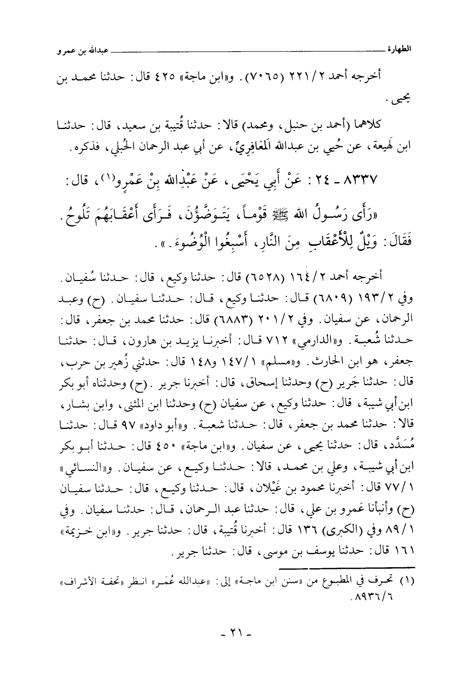 كلاهما (أحمد بن حنبل، ومحمد) قالا: حدَّثنا قُتَيبة بن سعيد، قال: حدَّثنا ابن لَهِيعة، عن حُيَي بن عبد الله المَعَافِري، عن أبي عبد الرحمن الحُبلي، فذكره.