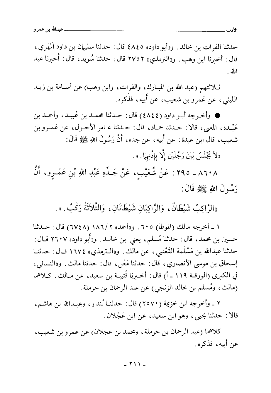 - أخرجه أبو داود (٤٨٤٤) قال: حدثنا محمد بن عُبيد، وأحمد بن عَبْدة، المعنى. قالا: حدثنا حماد، حدثنا عامر الأحول، عن عَمرو بن شعيب. قال ابن عبدة: عن أبيه، عن جده، أَنَّ رَسُولَ اللهِ صلى الله عليه وسلم قَالَ: