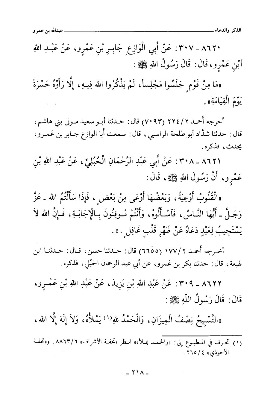 ٨٦٢١ - عَنْ أَبِي عَبْدِ الرَّحْمَانِ الْحُبُلِيِّ، عَنْ عَبْدِ اللهِ بْنِ عَمْرٍو، أَنَّ رَسُولَ اللهِ صلى الله عليه وسلم. قَالَ: