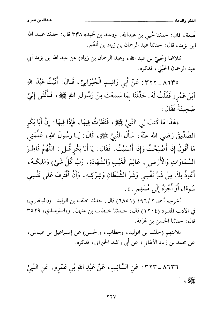 ٨٦٣٥ - عَنْ أَبِي رَاشِدٍ الْحُبْرَانِيِّ، قَالَ: أَتَيْتُ عَبْدَ اللَّهِ بْنَ عَمْرِو بْنِ الْعَاصِ، فَقُلْتُ لَهُ: حَدِّثْنَا مَا سَمِعْتَ مِنْ رَسُولِ اللَّهِ صلى الله عليه وسلم، فَأَلْقَى بَيْنَ يَدَيَّ صَحِيفَةً، فَقَالَ: