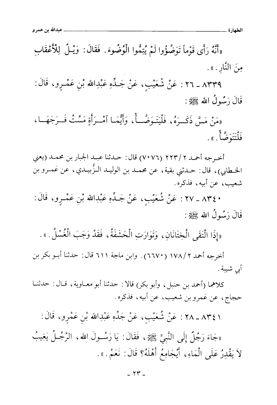 كلاهما (أحمد بن حنبل، أبو بكر) قالا: حدَّثنا أبو معاوية، حدَّثنا حجاج، عن عَمرو بن شُعيب، عن أبيه، فذكره.