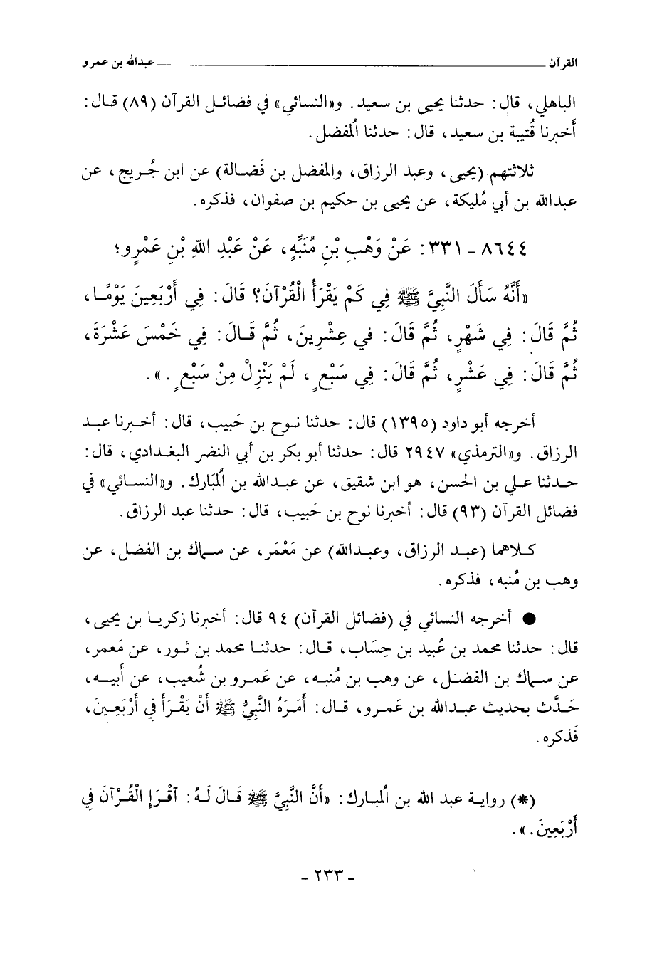 - لفظ ابن المبارك: عَنْ عَبْدِ اللهِ بْنِ عَمْرٍو؛ أَنَّ النَّبِيَّ صلى الله عليه وسلم قَالَ لَهُ: اقْرَإِ الْقُرْآنَ فِي أَرْبَعِينَ.