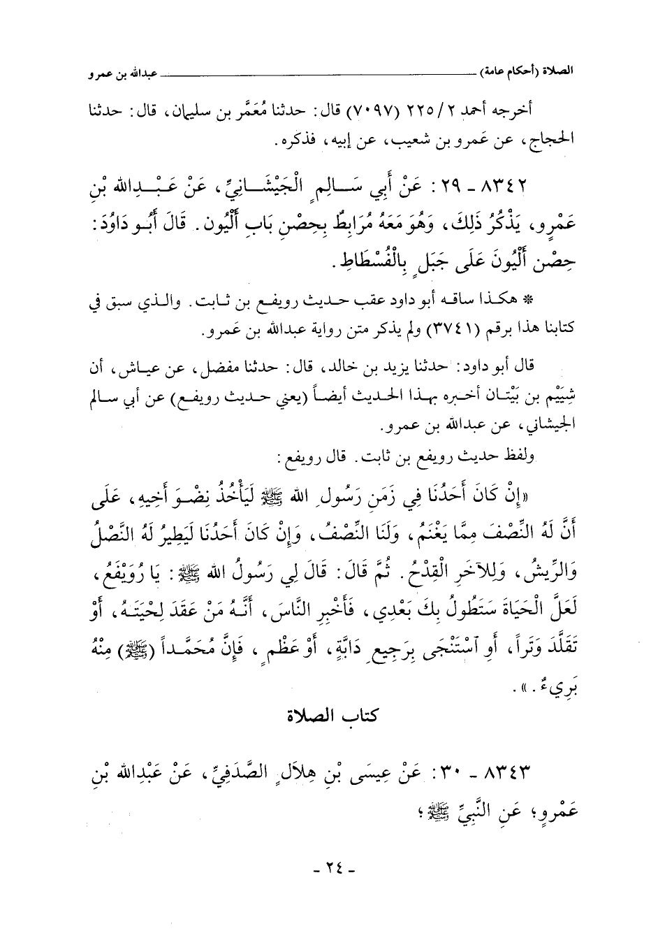 ٨٣٤٣ - عَنْ عِيسَى بْنِ هِلَالٍ الصَّدَفِيِّ، عَنْ عَبْد ِاللهِ بْنِ عَمْروٍ، عَنِ النَّبِيِّ صلى الله عليه وسلم؛