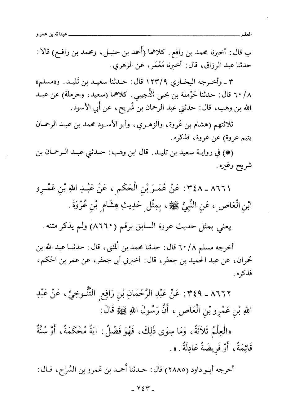 ٨٦٦١ - عن عمر بن الحكم، عَن عبد الله بن عَمرو بْن العَاصِ، عَنِ النبِيِّ صلى الله عليه وسلم، بِمِثْلِ حَديث هِشام بنِ عُروةَ