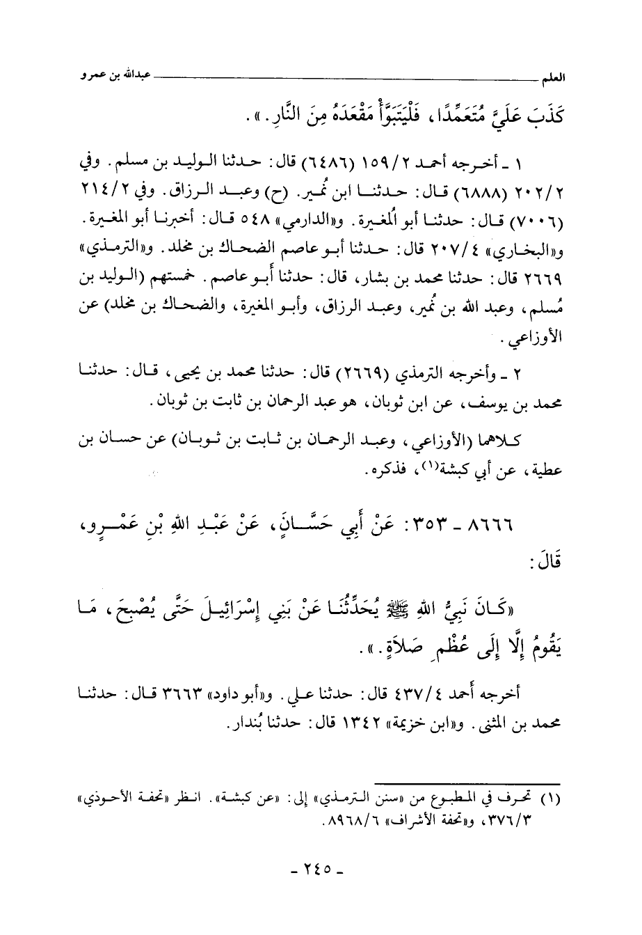 - وفي رواية: بَلِّغُوا عَنِّي وَلَوْ آيَةً، وَحَدِّثُوا عَنْ بَنِي إِسْرَائِيلَ، وَلَا حَرَجَ، فَمَنْ كَذَبَ عَلَيَّ كِذْبَةً، فَلْيَتَبَوَّأْ مَقْعَدَهُ مِنَ النَّارِ.