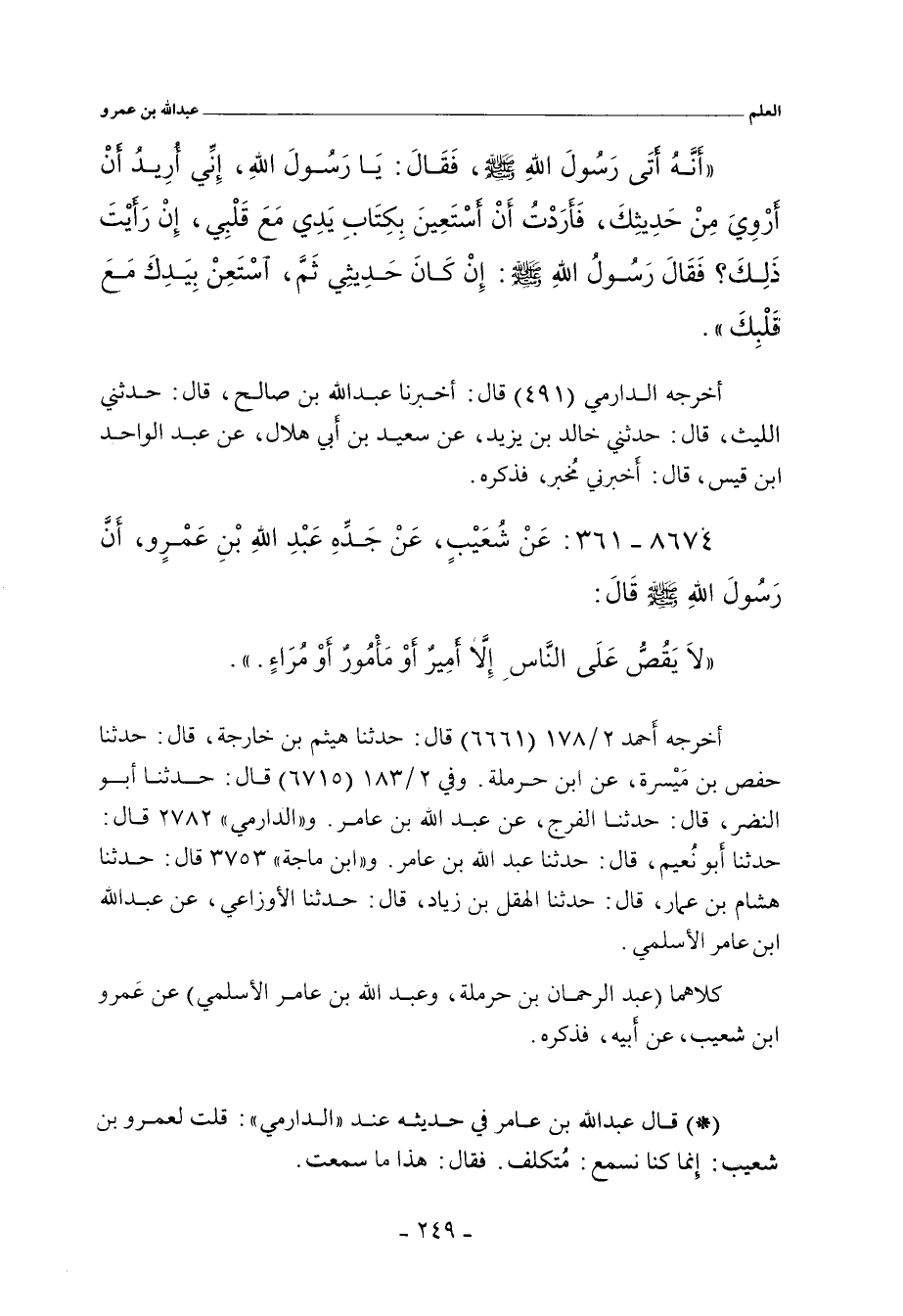 أَنَّهُ أَتَى رَسُولَ اللهِ صلى الله عليه وسلم. فَقَالَ: يَا رَسُولَ اللهِ، إِنِّي أُرِيدُ أَنْ أَرْوِيَ مِنْ حَدِيثِكَ، فَأَرَدْتُ أَنْ أَسْتَعِينَ بِكِتَابِ يَدِي مَعَ قَلْبِي، إِنْ رَأَيْتَ ذَلِكَ؟ فَقَالَ رَسُولُ اللهِ صلى الله عليه وسلم: إِنْ كَانَ حَدِيثِي ثَمَّ، اسْتَعِنْ بِيَدِكَ مَعَ قَلْبِكَ.