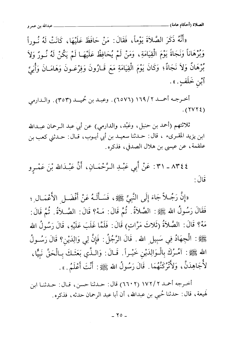أَنَّهُ ذَكَرَ الصَّلَاةَ يَوْمًا، فَقَالَ: مَنْ حَافَظَ عَلَيْهَا، كَانَتْ لَهُ نُورًا، وَبُرْهَانًا، وَنَجَاةً يَوْمَ الْقِيَامَةِ، وَمَنْ لَمْ يُحَافِظْ عَلَيْهَا، لَمْ يَكُنْ لَهُ نًورٌ، وَلَا بُرْهَانٌ، وَلَا نَجَاةٌ، وَكَانَ يَوْمَ الْقِيَامَةِ مَعَ قَارُونَ، وَفِرْعَونَ، وَهَامَانَ، وَأبَيِّ بْنِ خَلَفٍ.