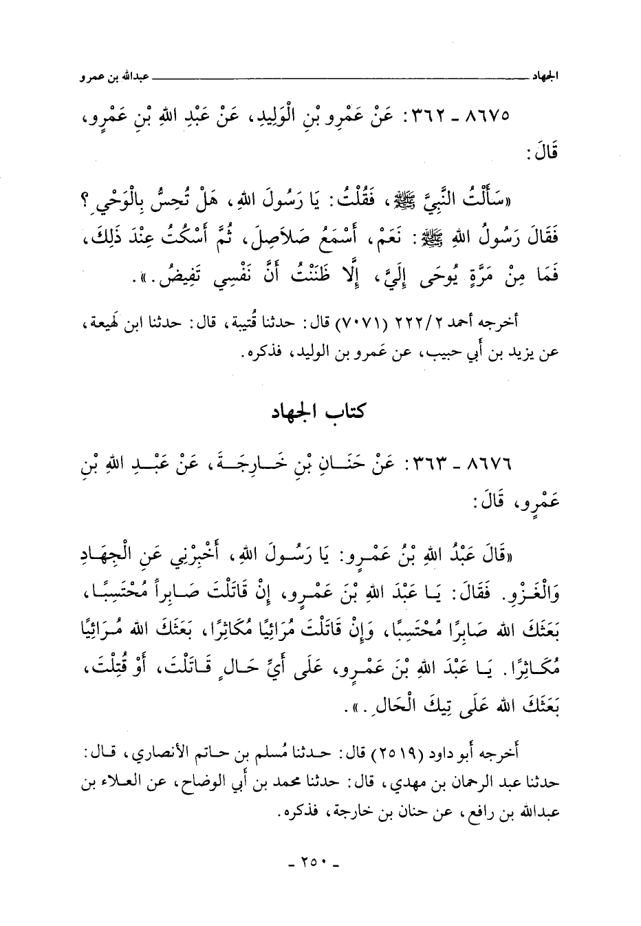 ٨٦٧٦ - عَنْ حَنَانِ بْنِ خَارِجَةَ، عَنْ عَبْدِ اللهِ بْنِ عَمْرٍو. قَالَ: