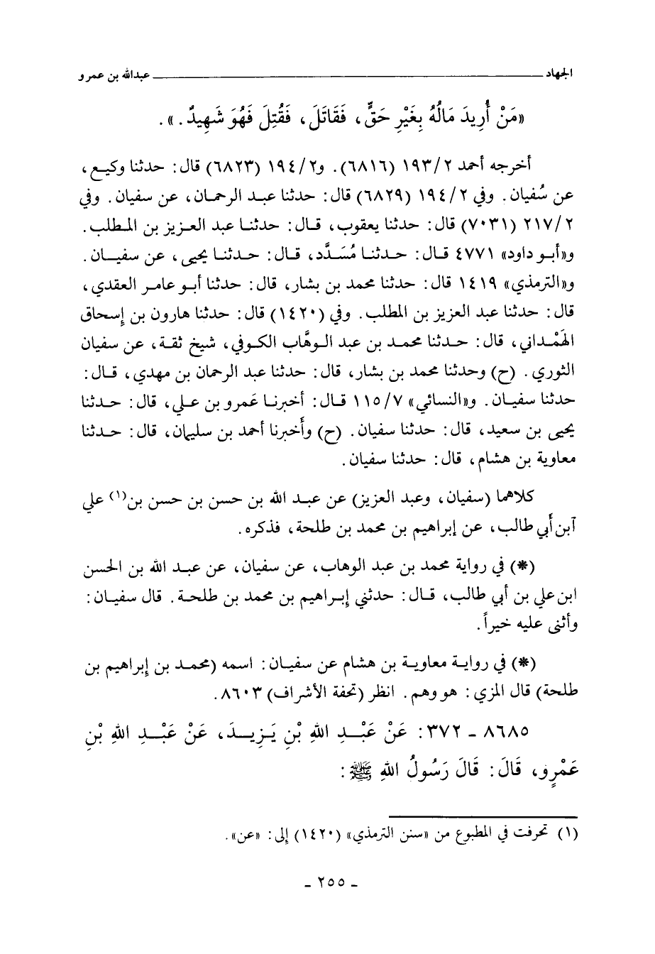 كلاهما (سفيان الثَّوْري، وعبد العزيز) عن عبد الله بن حسن بن حسن بن علي بن أبي طالب، عن إبراهيم بن محمد بن طلحة، فذكره.