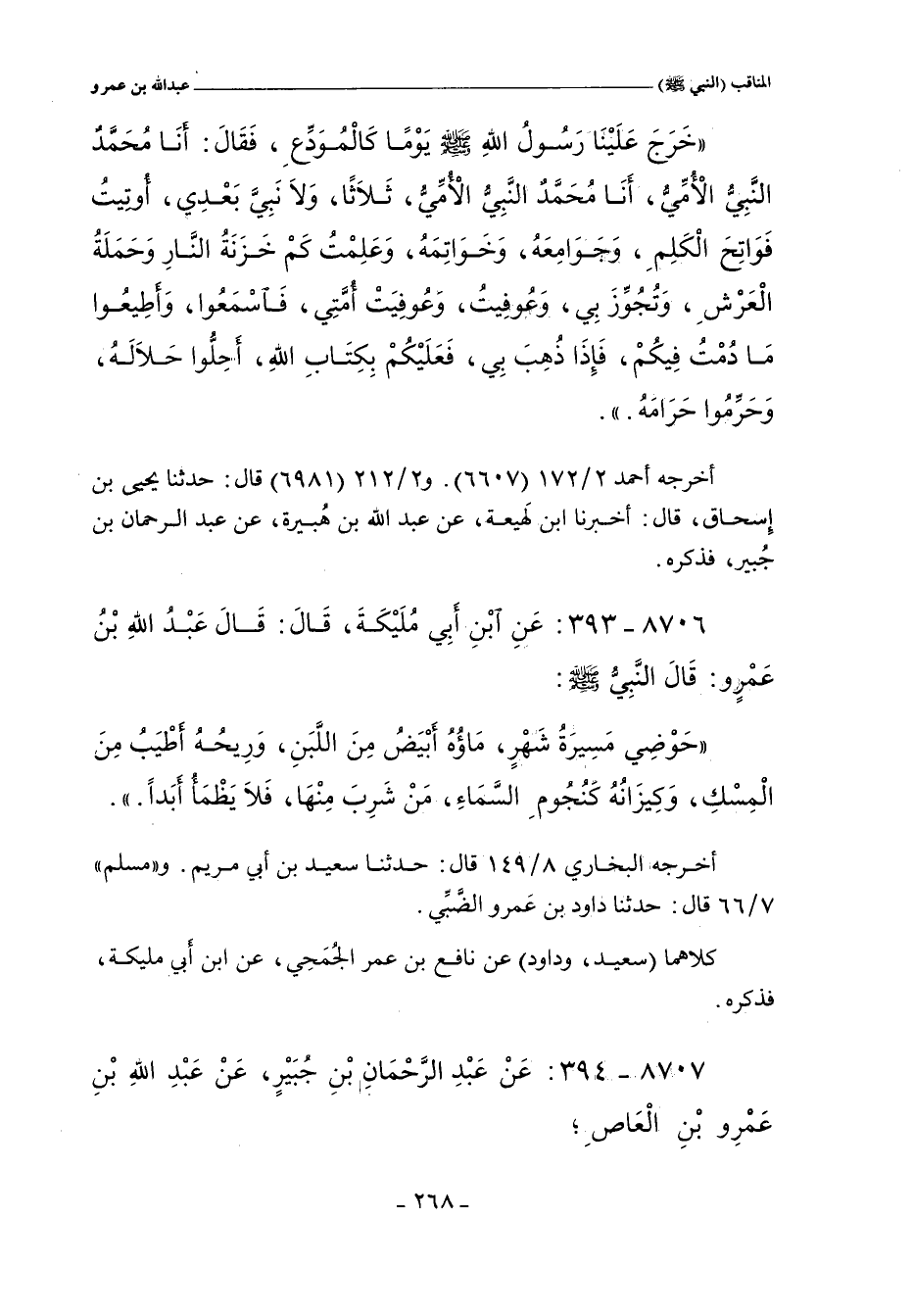 خَرَجَ عَلَيْنَا رَسُولُ اللهِ صلى الله عليه وسلم يَوْمًا كَالْمُوَدِّعِ. فَقَالَ: أَنَا مُحَمَّدٌ النَّبِيُّ الأُمِّيُّ، أَنَا مُحَمَّدٌ النَّبِيُّ الأُمِّيُّ، أَنَا مُحَمَّدٌ النَّبِيُّ الأُمِّيُّ، ثَلَاثًا، وَلَا نَبِيَّ بَعْدِي، أُوتِيتُ فَوَاتِحَ الْكَلِمِ، وَجَوَامِعَهُ، وَخَوَاتِمَة، وَعَلِمْتُ كَمْ خَزَنَةُ النَّارِ، وَحَمَلَةُ الْعَرْشِ، وَتُجُوِّزَ بِي، وَعُوفِيتُ، وَعُوفِيَتْ أُمَّتِي، فَاسْمَعُوا، وَأَطِيعُوا مَا دُمْتُ فِيكُمْ، فَإِذَا ذُهِبَ بِي، فَعَلَيْكُمْ بِكِتَابِ اللهِ، أَحِلُّوا حَلَالَهُ، وَحَرِّمُوا حَرَامَهُ.
