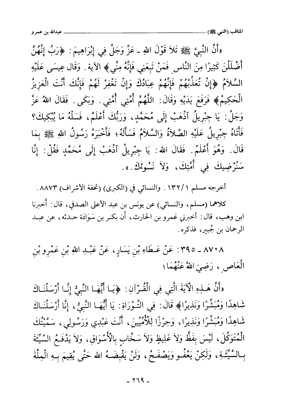 أَنَّ النَّبِيَّ صلى الله عليه وسلم تَلَا قَوْلَ اللهِ، عَزَّ وَجَلَّ، فِي إِبْرَاهِيمَ: " رَبِّ إِنَّهُنَّ أَضْلَلْنَ كَثِيرًا مِنَ النَّاسِ فَمَنْ تَبِعَنِي فَإِنَّهُ مِنِّي) الآية. وَقَال عِيسَى عَلَيْهِ السَّلَامُ: " إِنْ تُعَذِّبْهُمْ فَإِنَّهُمْ عِبَادُكَ وَإِنْ تَغْفِرْ لَهُمْ فَإِنَّكَ أَنْتَ الْعَزِيزُ الْحَكِيمُ) فَرَفَعَ يَدَيْهِ، وَقَالَ: اللَّهُمَّ أُمَّتِي. أُمَّتِي، وَبَكَى، فَقَالَ اللهُ عَزَّ وَجَلِّ: يَا جِبْرِيلُ، اذْهَبْ إِلَى مُحَمَّدٍ، وَرَبُّكَ أَعْلَمُ، فَسَلْهُ مَا يُبْكِيكَ؟ فَأَتَاهُ جِبْرِيلُ، عَلَيْهِ الصَّلَاةُ وَالسَّلَامُ، فَسَألَهُ، فَأَخْبَرَهُ رَسُولُ اللهِ صلى الله عليه وسلم بِمَا قَالَ، وَهُوَ أعْلَمً، فَقَالَ اللهُ: يَا جِبْرِيلُ، اذْهَبْ إِلَى مُحَمَّدٍ فَقُلْ: إِنَّا سَنُرْضِيكَ فِي أُمَّتِكَ، وَلَانَسُؤُكَ.