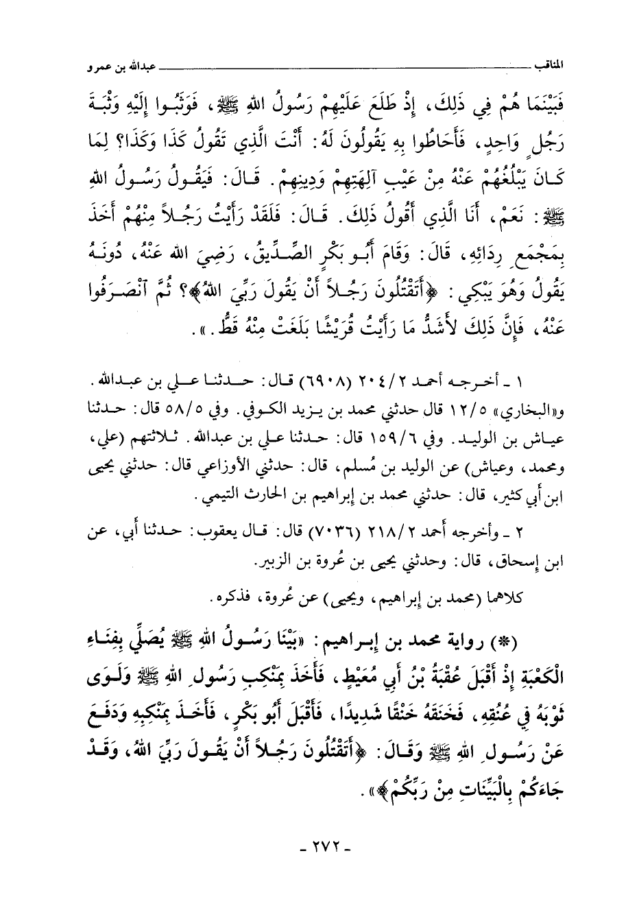 فَبَيْنَمَا هُمْ فِي ذَلِكَ، إِذْ طَلَعَ عَلَيْهِمْ رَسُولُ اللهِ صلى الله عليه وسلم، فَوَثَبُوا إِلَيْهِ وَثْبَةَ رَجُلٍ وَاحِدٍ، فَأَحَاطُوا بِهِ، يَقُولُونَ لَهُ: أَنْتَ الَّذِي تَقُولُ كَذَا وَكَذَا؟ لِمَا كَانَ يَبْلُغُهُمْ عَنْهُ مِنْ عَيْبِ آلِهَتِهِمْ وَدِينِهِمْ. قَالَ: فَيَقُولُ رَسُولُ اللهِ صلى الله عليه وسلم: نَعَمْ، أَنَا الَّذِي أَقُولُ ذَلِكَ. قَالَ: فَلَقَدْ رَأَيْتُ رَجُلاً مِنْهُمْ أَخَذَ بِمَجْمَعِ رِدَائِهِ. قَالَ: وَقَامَ أَبُو بَكْرٍ الصِّدِّيقُ، رَضِيَ اللهُ عَنْهُ، دُونَهُ يَقُولُ، وَهُوَ يَبْكِي: " أَتَقْتُلُونَ رَجُلاً أَنْ يَقُولَ رَبِّي اللَّهُ)؟ ثُمَّ انْصَرَفُوا عَنْهُ، فَإِنَّ ذَلِكَ لأَشَدُّ مَا رَأَيْتُ قُرَيْشًا بَلَغَتْ مِنْهُ قَطُّ.