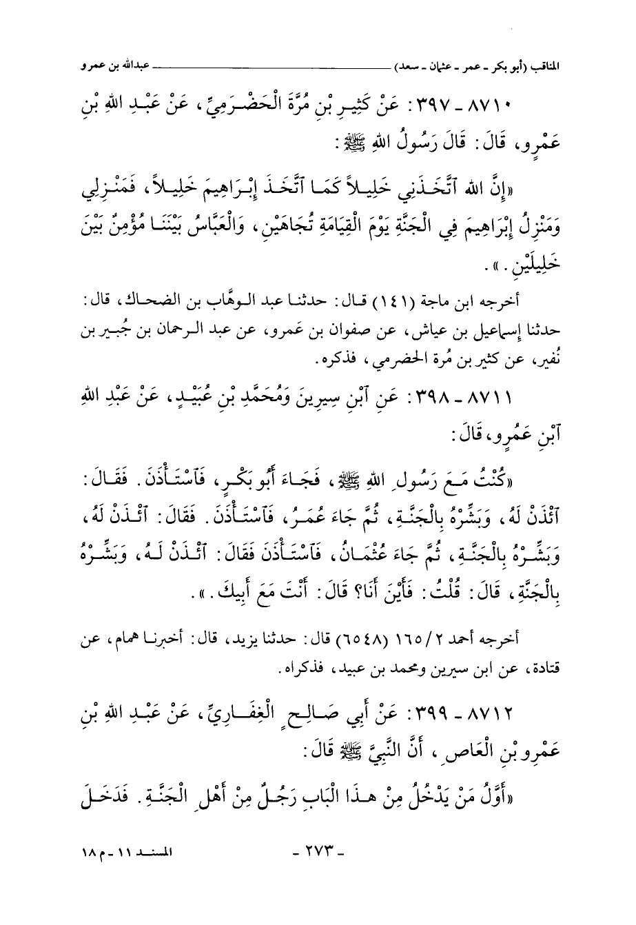 ٨٧١١ - عَنِ ابْنِ سِيرِينَ، وَمُحَمَّدِ بْنِ عُبَيْدٍ، عَنْ عَبْدِ اللهِ بْنِ عَمْرٍو. قَالَ: