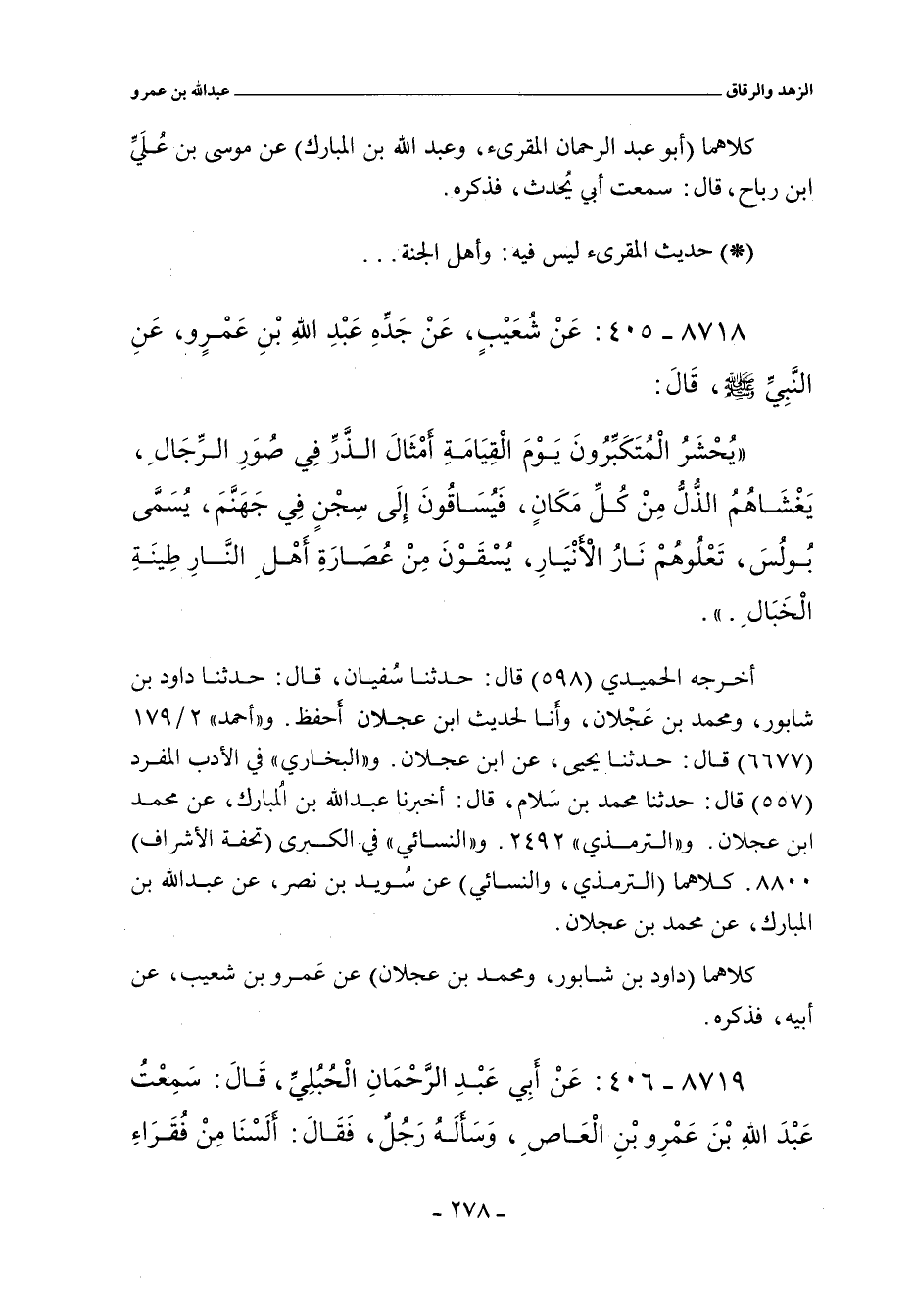 ٨٧١٨ - عَنْ شُعَيْبٍ، عَنْ جَدِّهِ، عَنِ النَّبِيِّ صلى الله عليه وسلم. قَالَ: