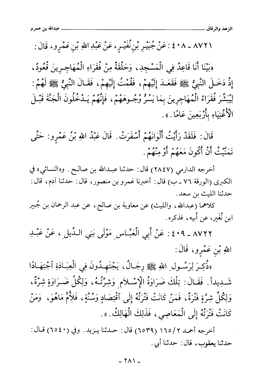 ٨٧٢١ - عَنْ جُبَيْرِ بْنِ نُفَيْرٍ، عَنْ عَبْدِ اللهِ بْنِ عَمْرٍو. قَالَ: