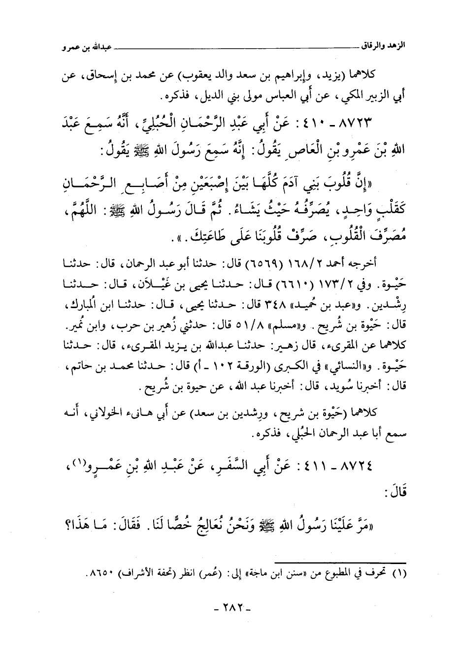 أخرجه أحمد ٢/ ١٦٨ (٦٥٦٩) قال: حدثنا أبو عبد الرحمن، حدثنا حَيْوة. وفي ٢/ ١٧٣ (٦٦١٠) قال: حدثنا يحيى بن غَيْلَان، حدثنا رِشْدين. و"عَبد بن حُميد" ٣٤٨ قال: حدثنا يحيى، حدثنا ابن المُبارك، حَيْوة بن شُريح. و"مسلم" ٨/ ٥١ (٦٨٤٤) قال: حدثني زُهير بن حرب، وابن نُمير. كلاهما عن المقرئ. قال زهير: حدثنا عبد الله بن يزيد المقرئ. قال: حدثنا حَيْوة. و"النَّسائي" في "الكبرى" ٧٦٩٢ قال: أَخْبَرنا محمد بن حاتم. قال: أَخْبَرنا سُويد. قال: أَخْبَرنا عبد الله، عن حيوة بن شُريح. وفي (٧٨١٢) قال: أخبرني محمد (٥) بن عبد الله بن يزيد المقرئ. قال: حدثنا أبي. قال: حدثنا حَيْوة.