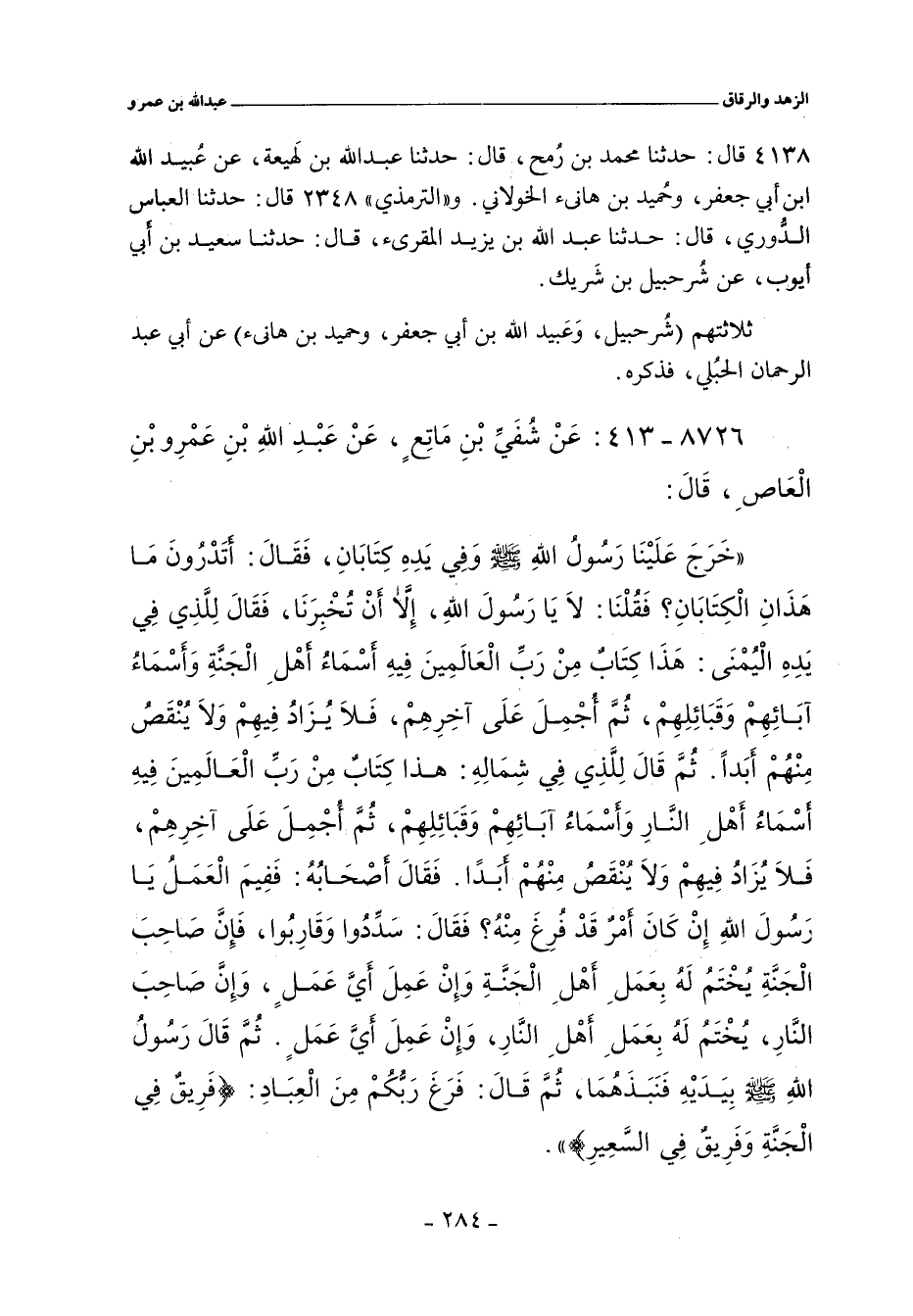 خَرَجَ عَلَيْنَا رَسُولُ اللهِ صلى الله عليه وسلم، وَفِي يَدِهِ كِتَابَانِ، فَقَالَ: أتَدْرُونَ مَا هَذَانِ الْكِتَابَانِ؟ فَقُلْنَا: لَا يَا رَسُولَ اللهِ، إِلَاّ أنْ تُخْبِرَنَا، فَقَالَ لِلَّذِي فِي يَدِهِ الْيُمْنَى: هَذَا كِتَابٌ مِنْ رَبِّ الْعَالَمِينَ، فِيهِ أسْمَاءُ أهْلِ الْجَنَّةِ، وَأَسْمَاءُ آبَائِهِمْ، وَقَبَائِلِهِمْ، ثُمَّ أُجْمِلَ عَلَى آخِرِهِمْ، فَلَا يُزَادُ فِيهِمْ، وَلَا يُنْقَصُ مِنْهُمْ أبَدًا، ثُمَّ قَالَ لِلَّذِي فِي شِمَالِهِ: هذا كِتَابٌ مِنْ رَبِّ الْعَالَمِينَ، فِيهِ أسْمَاءُ أهْلِ النَّارِ، وَأسْمَاءُ آبَائِهِمْ، وَقَبَائِلِهِمْ، ثُمَّ أُجْمِلَ عَلَى آخِرِهِمْ، فَلَا يُزَادُ فِيهِمْ، وَلَا يُنْقَصُ مِنْهُمْ أبَدًا. فَقَالَ أصْحَابُهُ: فَفِيمَ الْعَمَلُ يَا رَسُولَ اللهِ، إِنْ كَانَ أمْرٌ قَدْ فُرِغَ مِنْهُ؟! فَقَالَ: سَدِّدُوا وَقَارِبُوا، فَإِنَّ صَاحِبَ الْجَنَّةِ يُخْتَمُ لَهُ بِعَمَلِ أهْلِ الْجَنَّةِ، وَإِنْ عَمِلَ أَيَّ عَمَلٍ، وَإِنَّ صَاحِبَ النَارِ، يُخْتَمُ لَهُ بِعَمَلِ أَهْلِ النَّارِ، وَإِنْ عَمِلَ أَيَّ عَمَلٍ، ثُمَّ قَالَ رَسُولُ اللهِ صلى الله عليه وسلم بِيَدَيْهِ، فَنَبَذَهُمَا، ثُمَّ قَالَ: فَرَغَ رَبّكُمْ مِنَ الْعِبَادِ، فَرِيقٌ فِي الْجَنَّةِ، وَفَرِيقٌ فِي السَّعِيرِ.