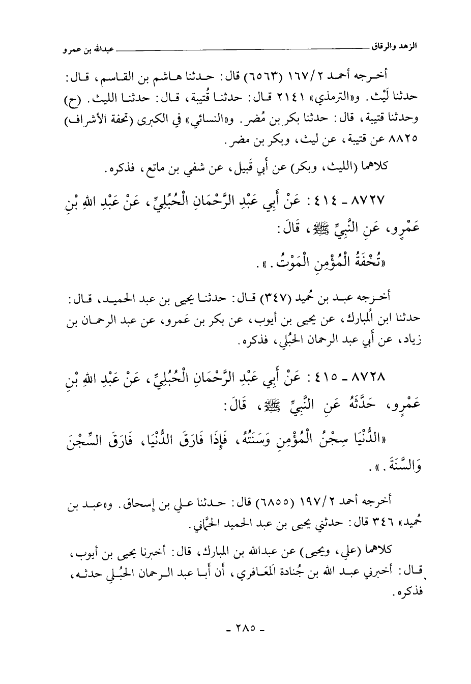 ٨٧٢٧ - عَنْ أبِي عَبْدِ الرَّحْمَانِ الْحُبُلِيِّ، عَنْ عَبْدِ اللهِ بْنِ عَمْرٍو، عَنِ النَّبِيِّ صلى الله عليه وسلم، قَالَ: