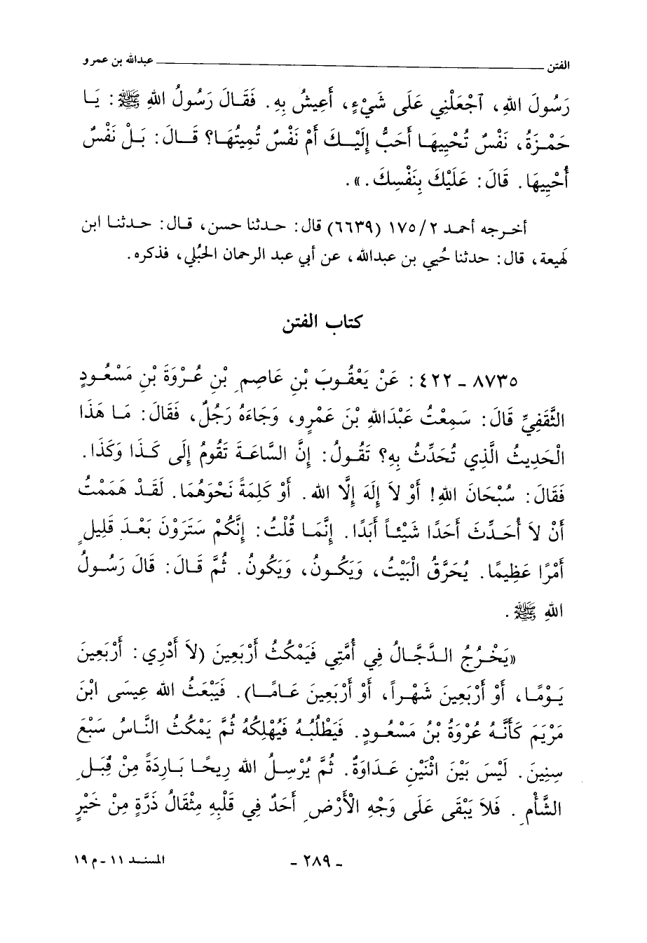 يَخْرُجُ الدَّجَّالُ فِى أُمَّتِي، فَيَلْبَثُ فِيهِمْ أَرْبَعِينَ، لَا أَدْرِى أَرْبَعِينَ يَوْمًا، أَوْ أَرْبَعِينَ عَامًا، أَوْ أَرْبَعِينَ لَيْلَةً، أَوْ أَرْبَعِينَ شَهْرًا، فَيَبْعَثُ اللَّهُ، عَزَّ وَجَلَّ، عِيسَى ابْنَ مَرْيَمَ صلى الله عليه وسلم، كَأَنَّهُ عُرْوَةُ بْنُ مَسْعُودٍ الثَّقَفِيُّ، فَيَظْهَرُ فَيُهْلِكُهُ، ثُمَّ يَلْبَثُ النَّاسُ بَعْدَهُ سِنِينَ سَبْعًا، لَيْسَ بَيْنَ اثْنَيْنِ عَدَاوَةٌ، ثُمَّ يُرْسِلُ اللَّهُ رِيحًا بَارِدَةً مِنْ قِبَلِ الشَّامِ، فَلَا يَبْقَى أَحَدٌ فِى قَلْبِهِ مِثْقَالُ ذَرَّةٍ مِنْ