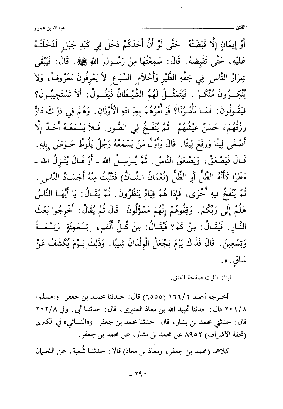 إِيمَانٍ إِلَاّ قَبَضَتْهُ، حَتَّى لَوْ أَنَّ أَحَدَهُمْ كَانَ فِى كَبِدِ جَبَلٍ لَدَخَلَتْ عَلَيْهِ (قَالَ: سَمِعْتُهَا مِنْ رَسُولِ اللَّهِ صلى الله عليه وسلم) وَيَبْقَى شِرَارُ النَّاسِ، فِى خِفَّةِ الطَّيْرِ، وَأَحْلَامِ السِّبَاعِ، لَا يَعْرِفُونَ مَعْرُوفًا، وَلَا يُنْكِرُونَ مُنْكَرًا، قَالَ: فَيَتَمَثَّلُ لَهُمُ الشَّيْطَانُ، فَيَقُولُ: أَلَا تَسْتَجِيبُونَ؟ فَيَأْمُرُهُمْ بِالأَوْثَانِ، فَيَعْبُدُونَهَا، وَهُمْ فِى ذَلِكَ دَارَّةٌ أَرْزَاقُهُمْ، حَسَنٌ عَيْشُهُمْ، ثُمَّ يُنْفَخُ فِى الصُّورِ، فَلَا يَسْمَعُهُ أَحَدٌ إِلَاّ أَصْغَى لَهُ، وَأَوَّلُ مَنْ يَسْمَعُهُ رَجُلٌ يَلُوطُ حَوْضَهُ، فَيَصْعَقُ، ثُمَّ لَا يَبْقَى أَحَدٌ إِلَاّ صَعِقَ، ثُمَّ يُرْسِلُ اللَّهُ، أَوْ يُنْزِلُ اللَّهُ، قَطْرًا، كَأَنَّهُ الطَّلُّ، أَوِ الظِّلُّ (نُعْمَانُ الشَّاكُّ) فَتَنْبُتُ مِنْهُ أَجْسَادُ النَّاسِ، ثُمَّ يُنْفَخُ فِيهِ أُخْرَى، فَإِذَا هُمْ قِيَامٌ يَنْظُرُونَ. قَالَ: ثُمَّ يُقَالُ: يَا أَيُّهَا النَّاسُ، هَلُمُّوا إِلَى رَبِّكُمْ، وَقِفُوهُمْ إِنَّهُمْ مَسْؤُولُونَ. قَالَ: ثُمَّ يُقَالُ: أَخْرِجُوا بَعْثَ