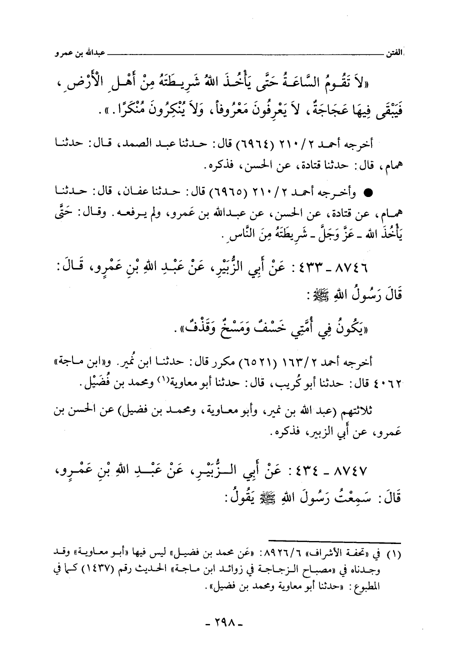 - أخرجه أحمد ٢/ ٢١٠ (٦٩٦٥) قال: حدثنا عفان، حدثنا همام، عن قتادة، عن الحسن، عن عبد الله بن عَمرو، ولم يرفعه. وقال: حَتَّى يَأُخذَ الله، عَزَّ وَجلَّ، شَرِيطتهُ مِن النَّاسِ